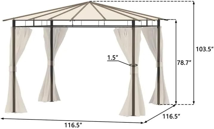 About this product Our 10ft. x 10ft. Maypex Steel Outdoor Patio Gazebo provides the perfect setting to entertain guests or relax in solace. With its durable steel frame, four convenient curtains with zippers, and a double-tiered roof for proper airflow, this gazebo is ideal for any outdoor event, like parties, picnics, and camping. Adult assembly is required and all instructions and hardware are included. Features: 10ft x 10ft Steel Frame Convenient Curtains w/ Zippers Double-Tiered Roof Perfect for Outdoor Events Adult Assembly Required Not Recommended for Extreme Weather