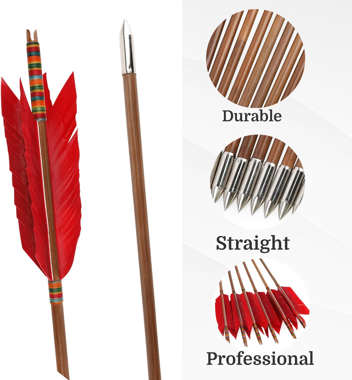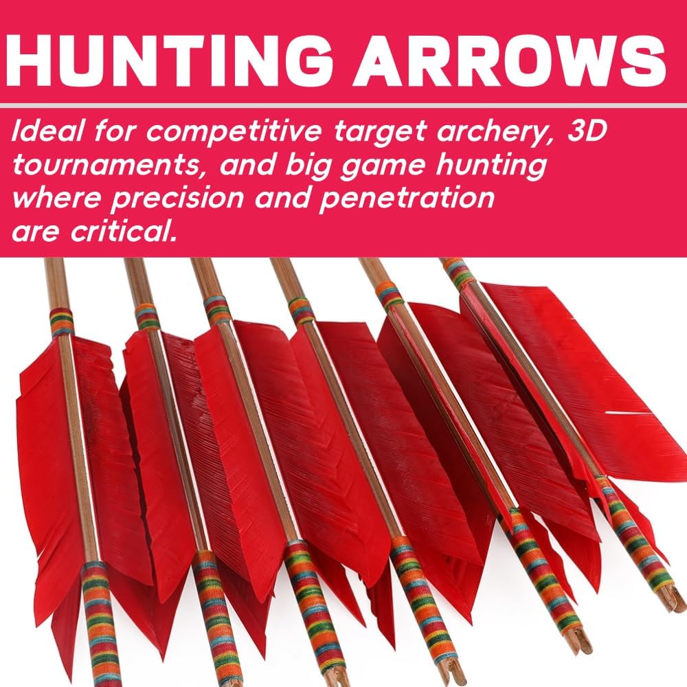 For traditional longbows and recurve bows. For bows draw weigt up to 50 lbs (50lbs included). Shaft Material: Alpine Tea Stick Bamboo . (Tip 1: Due to the natural growth of bamboo arow shaft with bamboo knots is inevitable, to prevail in kind.) Weight: about 35-40g (Tip 2: Due to material factors, can not guarantee the same weight.) Bamboo arrows should be kept in a cool, ventilated place and are prone to open in hot or overly dry environments. Note: 1.Do not shoot to hard objects (such as stone or concrete wall). This may damage your arrows and cause shattering or cracking. 2.Check the status of arrows before shooting. If you find cracks on one arrow shaft, please change another arrow for safety reasons. 3.Please use a proper bow within recommended draw weight range. Using a bow with too high draw weight may cause damage both to your bow and arrows. 4.This is not a toy. Do not shoot to people.
