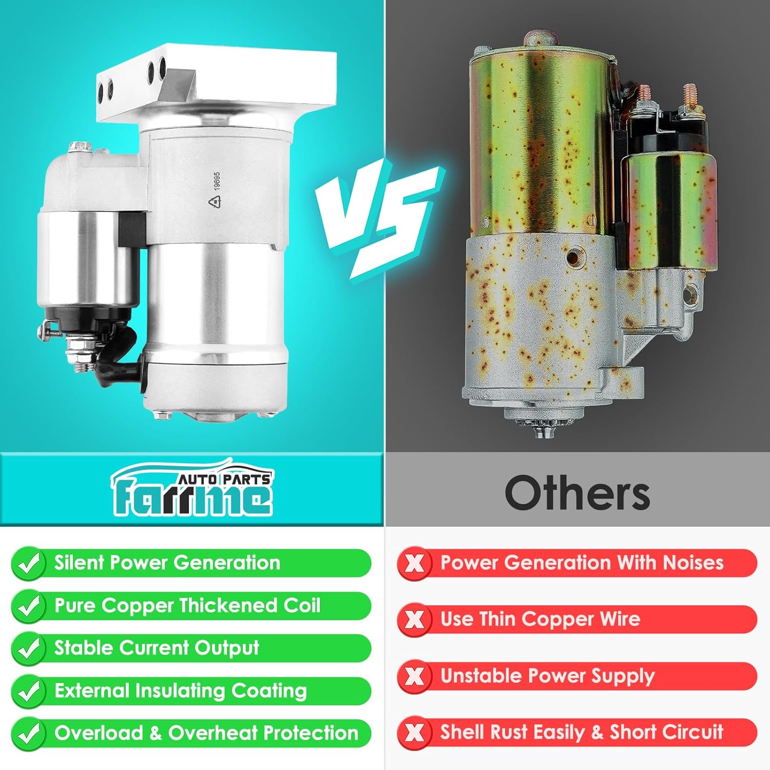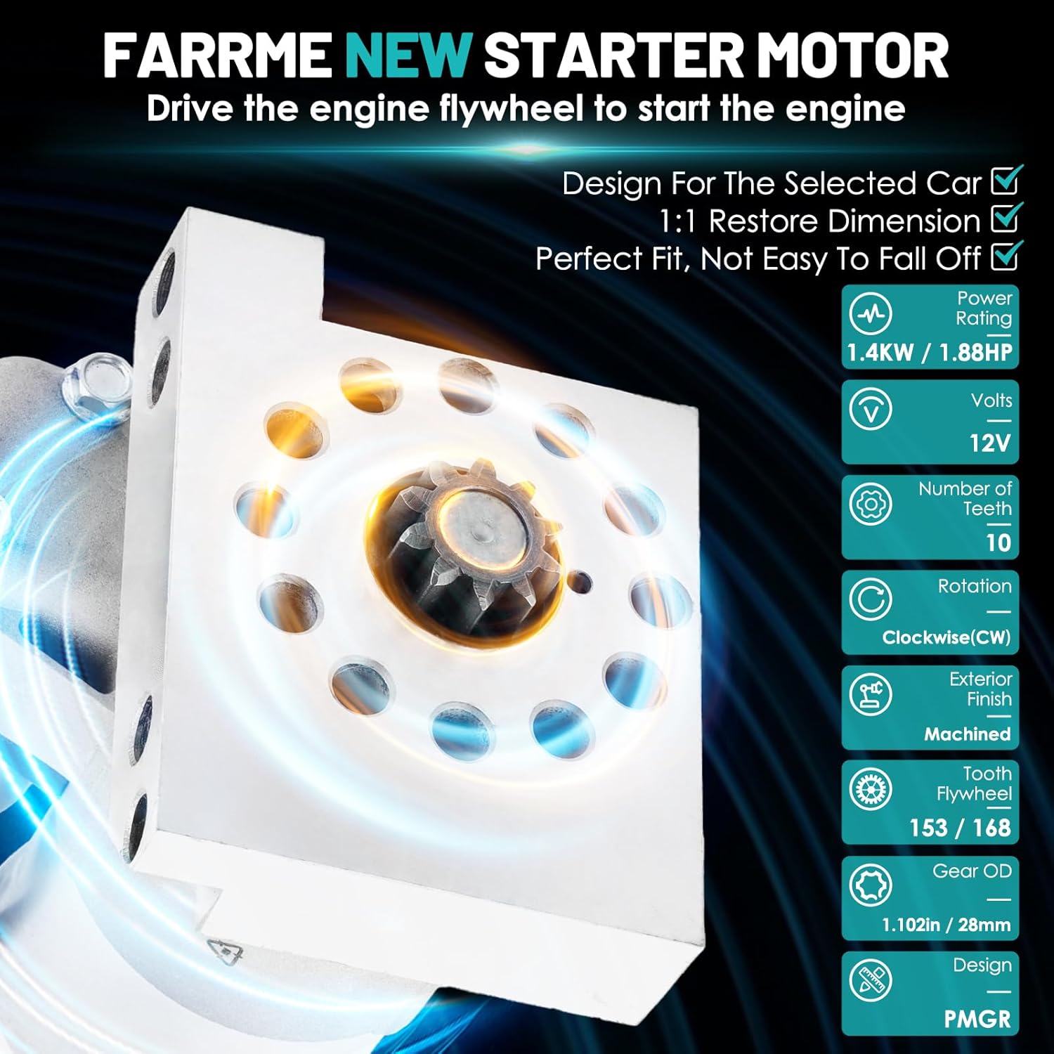Reliable power at your fingertips: Upgrade with Farrme high-performance starter motor!Starter Replacement Part Number:19695, 19695N, S114-823, S114-823S, 410-44119, HIT-PSL100, 2-2982-HI,HITPSL100, PSL100, SHI0157, S114823, S114823S, 22982HI, 41044119Car Starter Specification:All of our starters are tested to ensure product performance and durabilityPart Type: StarterVoltage: 12Power: 1.4kW / 1.88HPRotation: CW (Clockwise)Number of Teeth: 10Gear OD: 1.102in / 28mmMaximum Recommended Compression Ratio: 15.1:1, Gear Reduction Ratio: 3.73:1High Torque Starter Compatibility:REPLACEMENT FOR or COMPATIBLE WITH Chevrolet:1985-2002 AstroBase V6 4.3L1985-1995 AstroCL V6 4.3L1985-1994 AstroCS V6 4.3L1987-2002 AstroLT V6 4.3L1970-1975 Bel AirBase V8 7.4L1970-1972 BiscayneBase V8 7.4L1973-1999 BlazerBase V6 4.3LV8 Small/Big Block V6, with 153 or 168 Tooth Ring GearREPLACEMENT FOR or COMPATIBLE WITH Hatachi:Hatachi S114-823, S114-823SNote: Before purchasing a new starter motor, please verify the part number, OEM car starter pictures, specifications, vehicle make, model, and engine type to ensure this is the correct automotive replacement starter starters for your car.New Car Starter Motor Feature:1. Reliability: The car starter motor is designed and manufactured to provide high reliability, ensuring consistent engine starting in various conditions.2. Efficiency: The starter motor efficiently converts electrical energy into mechanical energy, delivering sufficient torque and speed for quick engine startup.3. Durability: Built with durable materials and precision engineering, the starter motor exhibits long-lasting performance, capable of withstanding frequent start cycles and harsh environmental conditions.4. Quick Start: Equipped with quick-start capabilities, the starter motor rapidly responds and initiates engine ignition, reducing wait times and unnecessary delays.5. Precise Control: Advanced control systems in the starter motor enable precise current regulation and smooth startup processes, ensuring reliable and controlled engine ignition.When to replace car starter motor:1. Difficulty Starting: Difficulty starting the car, requiring multiple attempts before it successfully starts.2. Unusual Noises: Hear grinding sounds, harsh metallic friction noises, or any other unusual sounds when starting the car.3. Power Issues: When turning the key or pressing the start button, if the engine fails to start or only produces clicking sounds without the normal cranking noise.【Important Tips】Farrme starter motors are brand-new and undergo 1OO% testing.Q1: The car has a new starter but won't start and makes a clicking sound.A1: In this situation, we must consider whether the fuel pump is damaged. A damaged fuel pump can cause a lack of fuel pressure during startup, resulting in the vehicle not starting.Q2: After replacing the starter with a new one, there is still a lot of noise.A2: The old starter damaged some teeth on the flywheel ring gear. So when we install a new starter, it may not fit perfectly with the ring gear, resulting in loud noise and difficulty starting. When replacing the starter, it is recommended to check the flywheel ring gear; otherwise, the new starter may not last long either.Q3: After replacing the car starter, the car won't start.A3: If the car battery is low, the car may not start. If the battery is not the issue, it is likely a problem with the ignition system. Insufficient voltage from the battery can also make it difficult to start the car.