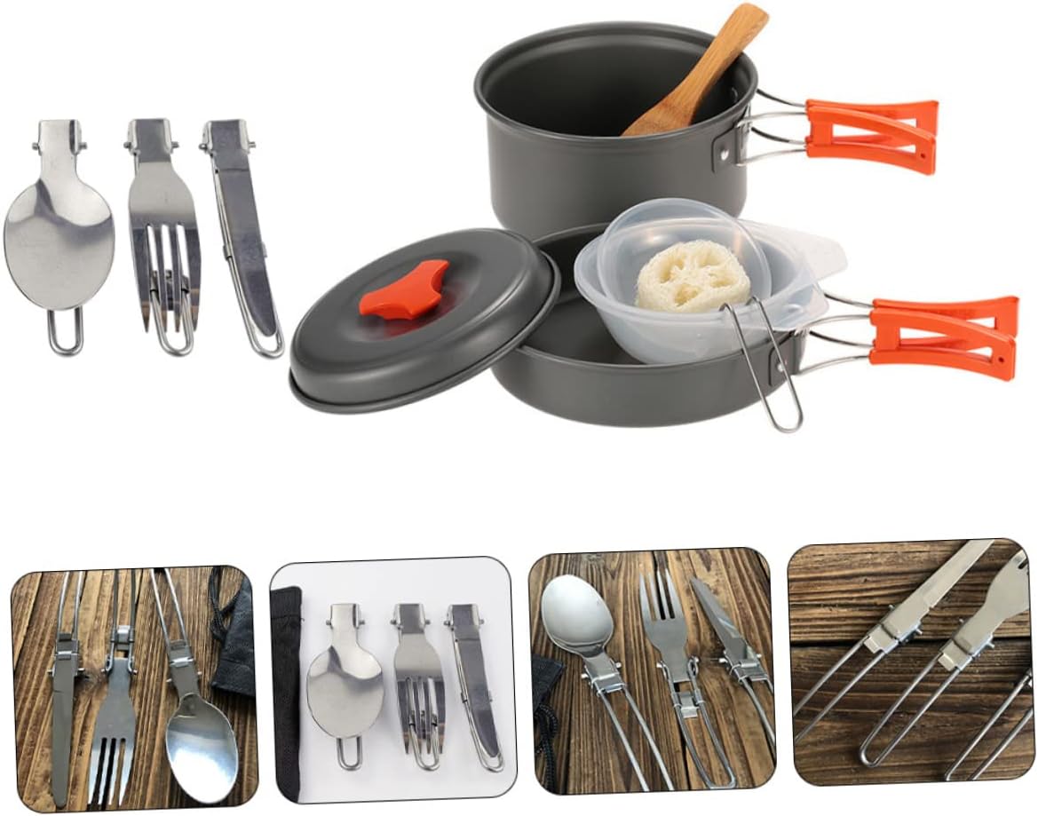 Package List 1 x Cooking Pot 1 x Fry Pan 1 x Soup Spoon 1 x Rice Scoop 1 x Loofah Cleaner 2 x Plastic Bowls 1 x Storage Bag 3 x Tablewares Characteristics -Color: Grey, Orange camping cookware -Size(Pot): About 14.50X14.50X8.00cm/ 5.70X5.70X3.14in camping tool -Size(Frying Pan): About 15.50X3.50cm/ 6.10X1.38in(Handle: About 10cm/ 3.94in.) camping cookware outdoor -Size: 24.50X14.50X8.00cm/9.63X5.70X3.14in cooking utensil camping kit -Material: Aluminum Alloy portable camping cookware -Size(Rice Scoop): About 16.00X7.80X2.00cm/6.29X3.07X0.78in camping cookware kit -Size(Bowl): About 11.00X4.00cm/ 4.33X1.57in camp cooking utensils -It's easy to clean, using these, it can give you a wonderful camping experience camping utensil. -Suitable for both outdoor and home use, it is not only for camping but also for mountaineering, fishing and barbecue outdoor cookware. -With all the necessary items in the kitchen, you can easily enjoy cooking outdoors camping kitchenware. -Adopted superior and , it will serve you for many years to come camping tools. -The cookware forms simple and convenient save space and facilitate carrying out multifunctional camping cookware.Goods Descriptionpicnic tools It is a time-saving cooking toolkit.camping cookware outdoor This item is an outdoor tableware kit, adoption of , durable and strong.camping cooking gear Suitable for camping, backpacking, picnics and other outdoor activities.camping tools Easy to store and use at home and outdoors