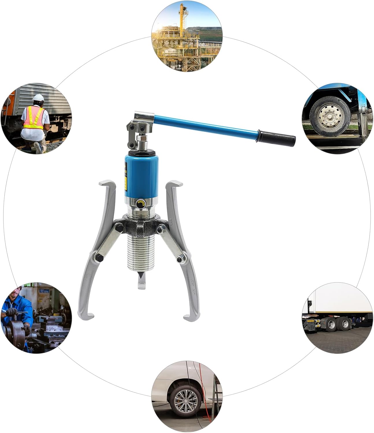 DetailsOil Return Switch: When applying pressure, tighten it in the ON direction, and when releasing pressure, tighten it in the OFF direction.Carrying Case: It allows you to store this product and easily carry it to the place you need.ApplicationIt is suitable for factories, repair sites, railways, vehicles, etc. It is used to disassemble truck wheels, sprockets, wheel bearings, pulleys, shaft sleeves, rotors, car axles, gears, etc.SpecificationsStyle: ModernColor: Light BlueMaterial: Alloy Steel, RubberProcess: ForgingAssembly Required: YesModel: YL-20Max. Stroke: 60mm/2.36inMax. Reach: 195mm/7.68inMax. Spread: 350mm/13.78inProduct Size(L*H): 50*51cm/19.69*20.08inHandle Length: 41cm/16.14inPackage Size: 56*28*11cm/22.05*11.02*4.33inRated Output: 20T/44092.45lbsGross Weight: 16.5kg/36.38lbsPackage Included1* Pump Body1* Handle3* Jaws1* Pull Ring6* Screws6* Pulling Tabs1* Carrying Case1* English ManualNotes1. Please read the English manual carefully before use.2. Please note that the rated output data is calculated using a calculation formula based on the size data of the length and diameter of the oil cylinder, so the rated output may have deviations and is only for reference.3. The effective distance of the piston starting rod of the hydraulic puller is only 1.97 inches, so the extension distance should not be greater than 1.97 inches during use.4. If you want to retract the piston activation rod, you only need to slightly loosen the oil return valve rod in a counterclockwise direction, and the piston activation rod will gradually retract.5. Before use, the hydraulic puller of the corresponding tonnage should be selected according to the outer diameter of the object to be pulled, saw, and load force, and avoid damage caused by overloading.6. The hydraulic puller uses (GB443-84) N15 mechanical oil (not included) at 23-113°F and (GB442-64) synthetic spindle oil (not included) at -4-41°F.7. As the new or long-term used hydraulic puller has more air in the cylinder, please move the handle first without loading 2-3 times to eliminate air.8. Please note that the area with the blue outer cover is not an oil cylinder, but rather an oil storage rubber bag inside. The painted cover is for protection! The square tooth trapezoidal thread is the true part of the oil cylinder.9. Please allow the slight color difference caused by the shooting light and 1-3cm error due to manual measurement, and make sure you do not mind before you order.
