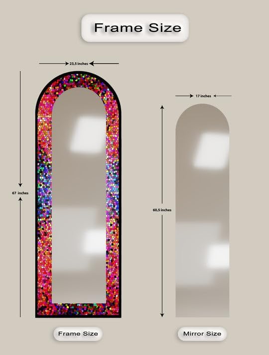 Arch Shaped Floor Mirror with Metal Frame – Gold, Black, or Silver | Leaning, Standing, or Wall-Mounted Full Body Mirror Add artistic charm and functional elegance to your space with our Arch Full Length Mirror, designed to make a bold statement in any room. Whether styled in a bedroom, hallway, or living room, this arched floor mirror enhances your interior with timeless beauty. The edges of the mirror consist of pictures in the colors of your choice printed on tempered glass using the UV printing technique. The mirror itself is mounted on top of this printed tempered glass, giving it a vibrant, durable, and luxurious finish that stands out in any setting. Measurements; TOTAL SIZE (Uv Printed Tempered Glass + Mirror) : 23,5’’W x 67’’ H ONLY MIRROR SIZE : 17’’W x 60,5’’ H Choose from three premium frame finishes—Arch gold mirror, sleek black, or arch floor mirror silver—and enjoy flexible use as a Standing Floor Mirror, Arched Wall Mirror, or casually leaned for a designer look. This is more than a Full Body Floor Mirror with Stand—it’s a piece of functional art. Multiple Placement Methods, This arched floor mirror comes with a U-shaped bracket, which you can freely place in the living room or bedroom. For your convenience in hanging on the wall, special hangers are designed on the back of the mirror.Our premium mirrors are crafted by gluing 4mm tempered glass to a 4mm mirror, combining durability and style. The tempered glass features UV printing for a glossy, vibrant look, while both the glass and mirror have smooth, grinded edges for safety. The hidden metal hanger ensures a sleek, ready-to-hang design, making it an elegant and functional addition to any room.