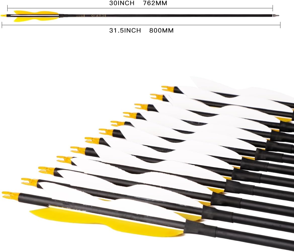 CUPID is a professional archery equipment manufacturer dedicated to creating a perfect archery experience for consumers. The 7.8mm real feather carbon arrow is one of the high cost performance products exclusively designed by CUPID.Product Details:Shaft Material: CarbonFeather Material: Turkey FeatherShaft Length:30"Full Length: 31.5"Outer Diameter: 7.8mmSpine: 500Weight: 33gDraw Weight: 30-50lbsRemovable TipsCondition: New itemPackage includes :12 pieces of carbon arrowsNote:1. Please do not shot at any hard things, like concrete wall or any hard substances.2.When practice, players must wear protective gear and take some protective measures. Minors should use bows and arrows under the guardianship of their parents.