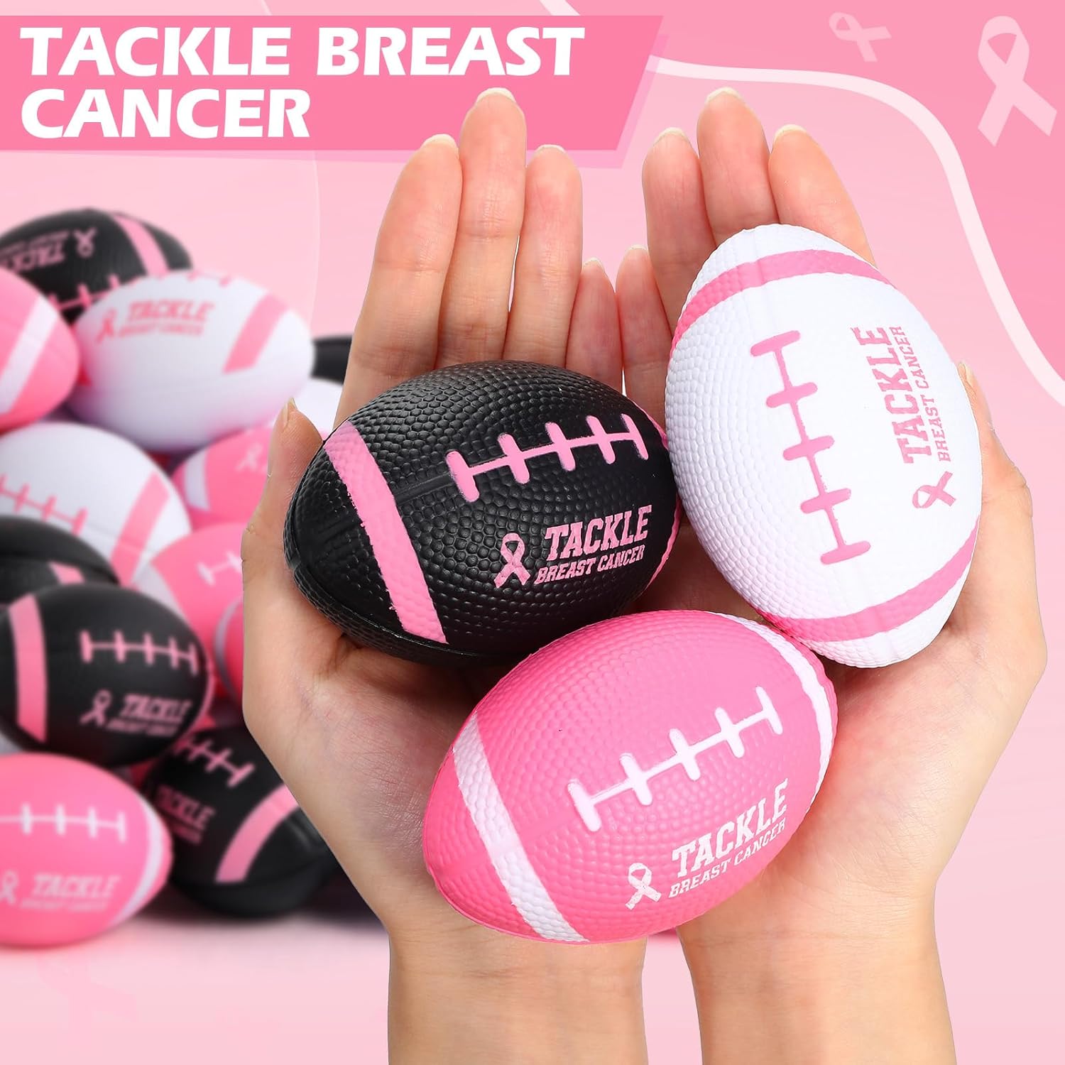Features: Wide application: These football party supplies with breast cancer awareness themes are suitable for charity events, cancer awareness events, non-profit fundraisers and more. You can also use them as party favors, stress reliever balls, party decorations and so on. Stress relief toys: The sports stress ball serve as an entertaining solution for stress relief. Enjoy hours of fun bouncing, shooting hoops, or squeezing as a toy. This functional toy helps with hand rehabilitation, exercises hand muscles, relieves hyperactivity, restlessness, and agitation, and improves your hand-eye coordination. Specifications: Material: PU foam Color: pink, black, white Size: about 3.5 inches/ 9 cm in length Package includes: 36 x Breast cancer awareness pink ribbon stress balls Notes: Manual measurement, please allow slight errors on size. The color may exist a slight difference due to different screen displays. These products are only suitable for kids over 12 years old