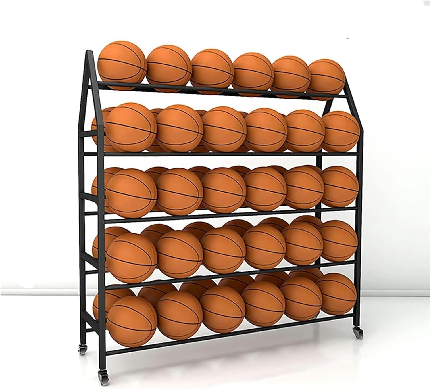 ●Product Description:Whether you need a simple storage solution for your sporting goods, or additional shelf space in your home gym, garage, or anywhere in the house, our sport storage System is your best chose. It is ideal for the garage, home, Storage room, playroom, gym, playgroup and schools.●Specifications:Material: SteelColor: Black Size & Capacity: 4 tier- 123x35x112cm, hold 35 No.4/5 ball or 28 No.7 ball; 4 tier- 140x35x112cm, hold 42 No.4/5 ball or 35 No.7 ball; 5 tier- 140x35x140cm, hold 54 No.4/5 ball or 45 No.7 ball;●Features:The large storage container has space for basketballs, footballs, soccer balls, volleyball, helmets and sports equipment.Organize all your sports equipments together, make your stadium and game room much better.Rolling wheel design, easy to move organizer indoors and outdoors, and fits in a specific position.●Package Content: 1× Ball Storage Rack(Does not include other items shown in the picture)●Precautions:Because it is processed by hand, the finished product usually has an error of 1-3 cm, please understand.There may be some differences between the image and the product due to display and lighting reasons, please refer to the actual product.