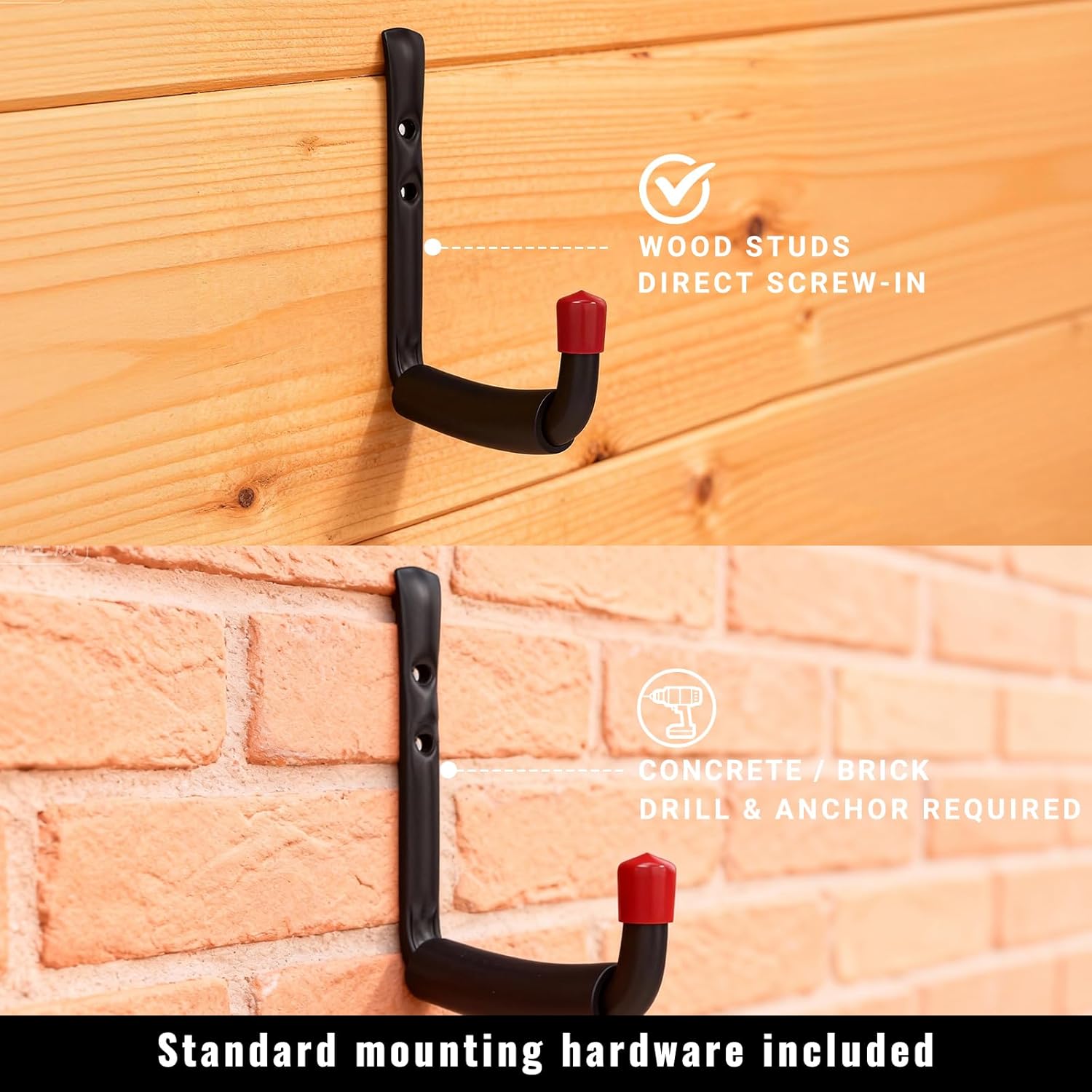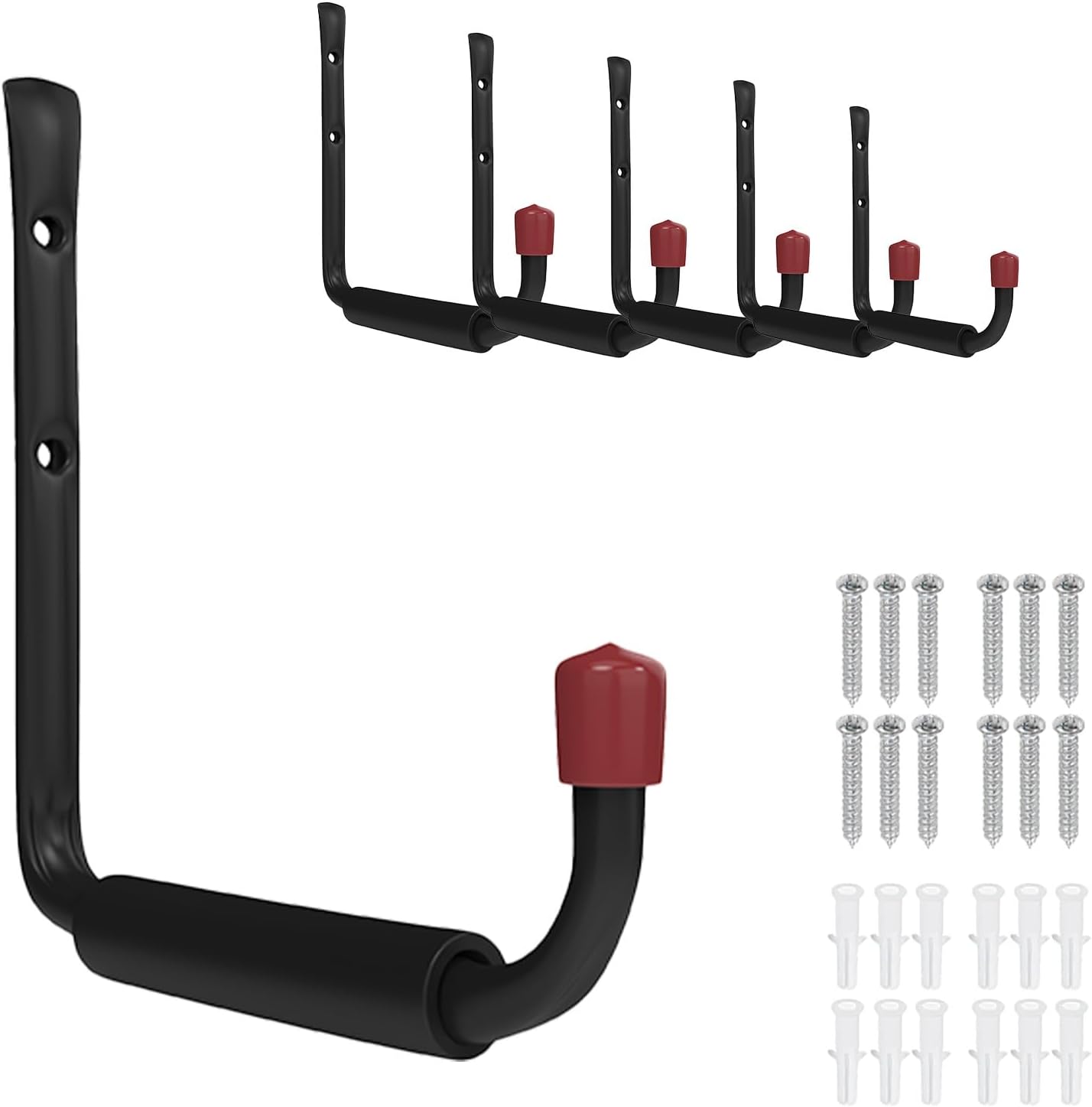 PREMIUM ORGANIZATION SOLUTION Clear the clutter with our heavy-duty j hooks. Designed as the ultimate garage storage hooks, they provide a high-capacity storage system to keep your workshop, shed, or basement organized and your essential tools within reach. 55 LBS CAPACITY & GEAR PROTECTION Built with reinforced steel, our tool holder wall mount supports up to 55 lbs. These outperform standard heavy duty hooks for hanging 50 lbs, featuring thick EVA padding and non-scratch silicone tips that prevent dents, scratches, and slipping. VERSATILE & EASY TO INSTALL Perfect for use as bike hooks or tool hangers for garage wall storage, these hooks accommodate ladders, chairs, and power tools effortlessly. Each set includes all necessary hardware for a quick, secure installation on various wall types.