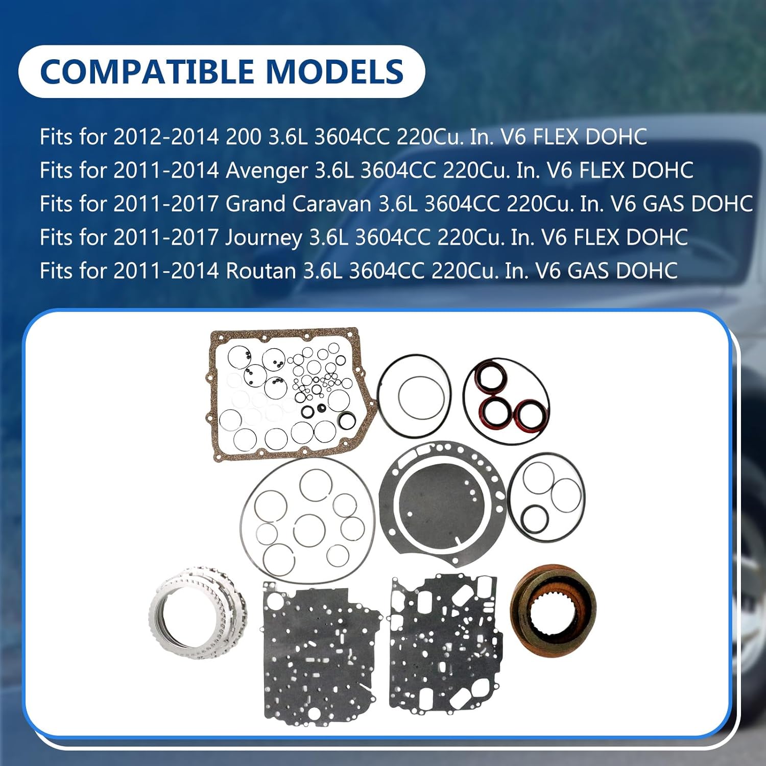 Transmission Master Rebuild Kit: High quality and durability Replace Part: 62TE B077820C B077880C W077881C Compatible Models: Fits for 2012-2014 Chrysler 200 2.4L Fits for 2012-2014 Chrysler 200 3.6L Fits for 2007-2008 Chrysler Pacifica 4.0L Fits for 2007-2010 Chrysler Sebring 3.5L Fits for 2008-2010 Dodge Avenger 2.0L Fits for 2010-2014 Dodge Avenger 2.4L Fits for 2008-2010 Dodge Avenger 2.7L Fits for 2008-2010 Dodge Avenger 3.5L Fits for 2011-2014 Dodge Avenger 3.6L Fits for 2007-2010 Dodge Grand Caravan 3.3L Fits for 2011-2017 Dodge Grand Caravan 3.6L Fits for 2007-2010 Dodge Grand Caravan 3.8L Fits for 2008-2010 Dodge Grand Caravan 4.0L Fits for 2009-2010 Dodge Journey 3.5L Fits for 2011-2017 Dodge Journey 3.6L Fits for 2014-2015 Ram ProMaster 1500 3.6L Fits for 2011-2014 Volkswagen Routan 3.6L Fits for 2009-2010 Volkswagen Routan 3.8L Fits for 2009-2010 Volkswagen Routan 4.0L Auto Transmission Rebuild Kit Features: Excellent workmanship, solid and durable material Pre-shipment quality control for guaranteed quality Stable performance, easy to install You Will Get: 1set 62TE Auto Transmission Master Rebuild Kit with Overhaul Seals Warm Tips: 1. Please check the product model carefully before purchase, the number is the same as yours 2. Please standardize the installation to ensure that the product can be well adapted to your car Our Advantages: We have been committed to developing excellent auto parts products, providing customers with reliable high-quality products. And we have a professional customer service team to provide timely services to customers and enhance the shopping experience.