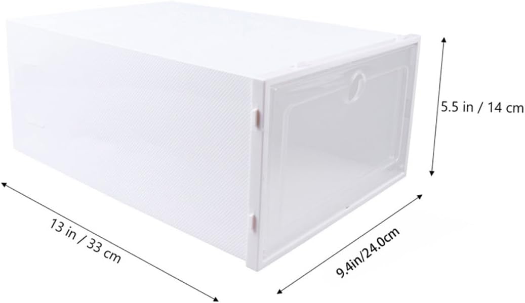 Package List 6 x shoes box Features -Product Info:Shoe box - Material: Plastic clear shoe boxes stackable. - Size: 33.00X24.00X14.00cm/12.97X9.43X5.50in shoes storage organizer. - Use a simple and convenient way to storage your shoes clear shoe boxes with lids. - Made of material, and safe to use shoe containers. - Transparent window design, you will know its content without opening and find your shoes quickly stackable shoe bins. - your shoes , scratch, and other damages shoes boxes. - Make your home clean and organized shoe storage.Goods Descriptionshoes boxes Drawer-style for easy to use.clear shoe boxes This set of storage shoes made of plastic which is safe and .shoes storage organizer Are you still worried about use what kind of box or container to prevent your shoes ? This shoes box can be a good choice to you