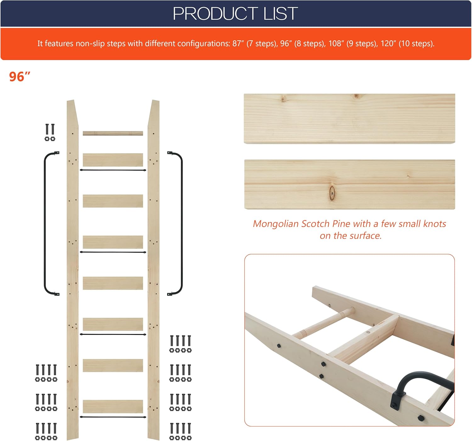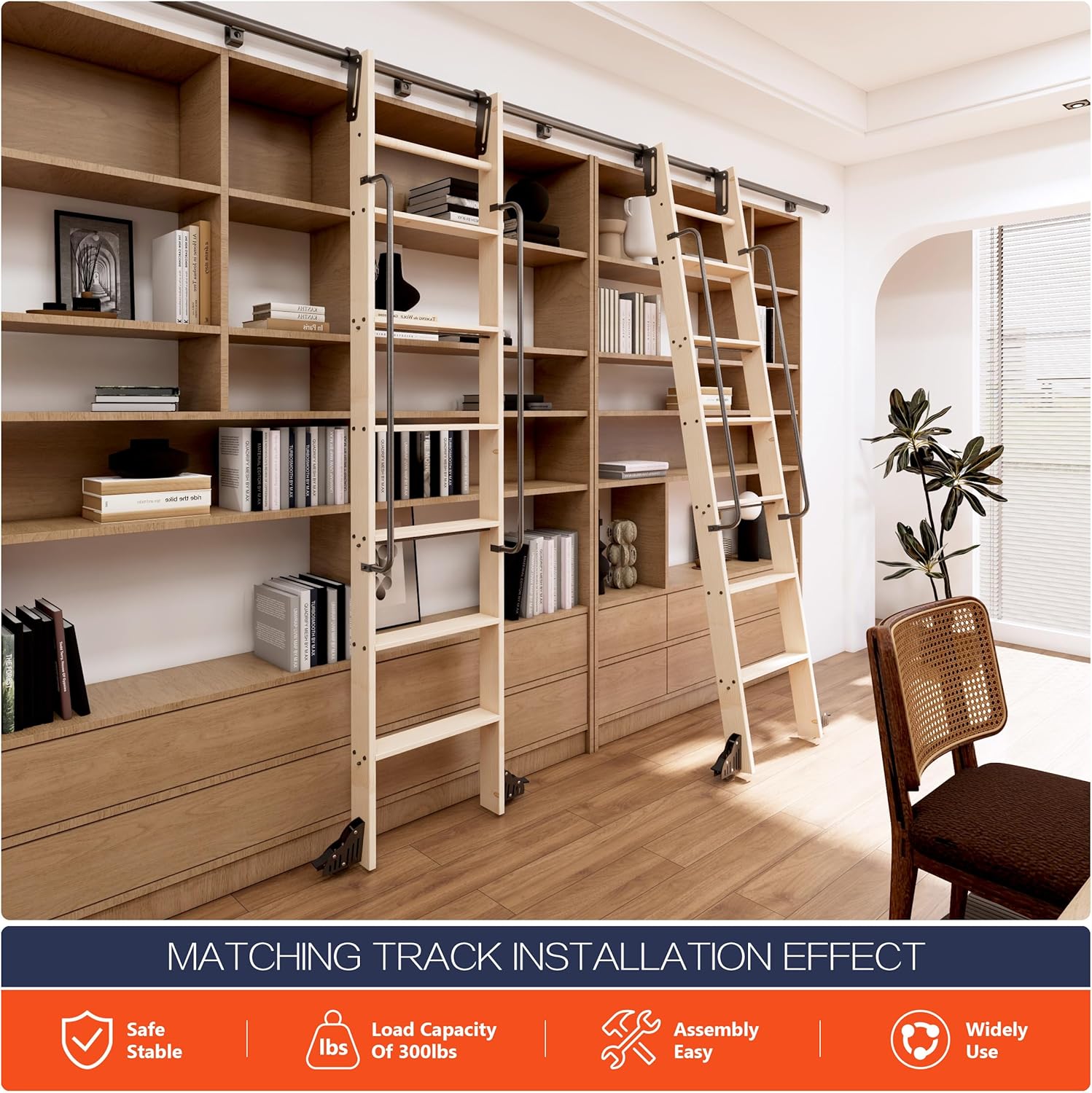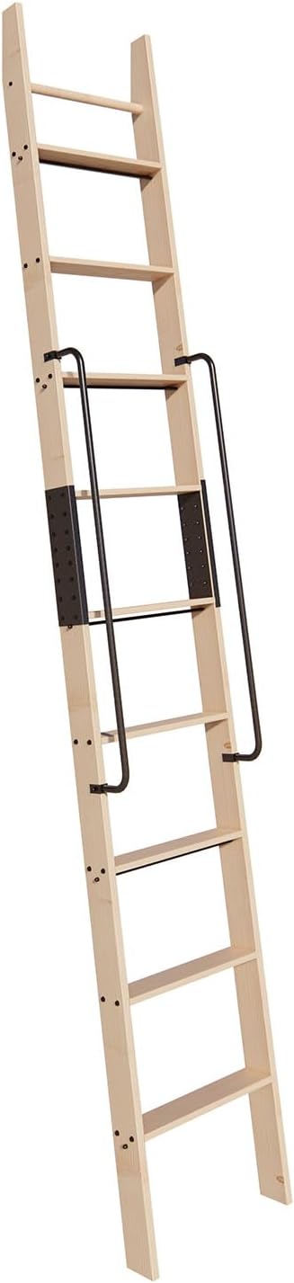 Bring both function and elegance to your home with this premium knotty pine wood library ladder. Made from high-quality unfinished knotty pine, it features natural grain patterns that add warmth to any space. The smooth, unfinished surface makes it easy to customize—paint, stain, or seal it to perfectly match your interior style. Despite being lightweight for easy handling, this ladder is engineered to support up to 300 lbs, making it sturdy enough for everyday use in home libraries, lofts, or closets. The 42-3/4" black handrail offers a secure grip, ensuring safe and comfortable climbing to reach high shelves. Choose from multiple height options: 87" and 96" (single solid plank) or 108" and 120" (two connected planks with heavy-duty step-wrapping connectors for superior stability). Designed for DIY enthusiasts, this ladder pairs perfectly with our sliding library ladder hardware (sold separately) and includes all necessary screws and hardware for a straightforward installation. Whether you’re building a classic sliding library ladder or upgrading your loft access, this knotty pine ladder delivers durability, customization, and timeless charm.