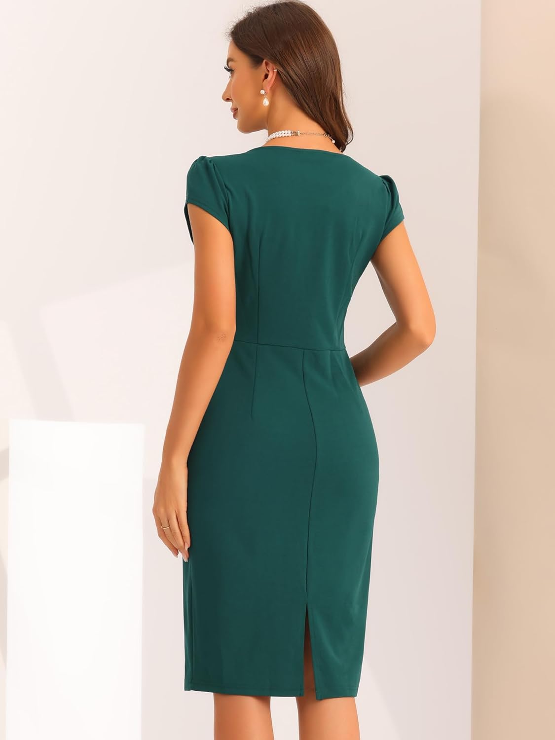 Allegra K Vintage Sheath Dress for Women's V Neck Cap Sleeves Split Pencil DressesSweetheart V NeckInvisible Side ZipperShort Cap SleeveButton DecorSlightly StretchySoft FabricRegular FitWith soft fabric, this elegant pencil dress with special and classic, fit and flared hem design adds to your choice for the upcoming seasons.Breathable and stretch material, this workwear classic dress can perfectly draw out your waistline and elongate your legs.The solid color dress office wear can pair with high heels can build a urban chic elegant business lady look.