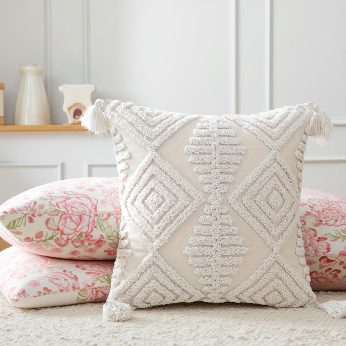 Transform your living space with this charming boho-inspired throw pillow cover. Featuring intricate tufting and embroidered details, this 18x18 inch cushion cover adds both texture and visual interest to any room. The decorative tassels provide a playful touch while maintaining a sophisticated aesthetic. Perfect for couches, chairs, or beds, this versatile cover brings warmth and character to your home decor. The textured design creates a handcrafted look that complements various interior styles from modern to rustic. Its standard 18x18 inch size fits most throw pillows, making it an easy way to refresh your space. The soft material ensures comfort while the detailed craftsmanship promises lasting style. Add a touch of artisanal flair to your home with this beautiful accent piece that seamlessly blends comfort with contemporary design.