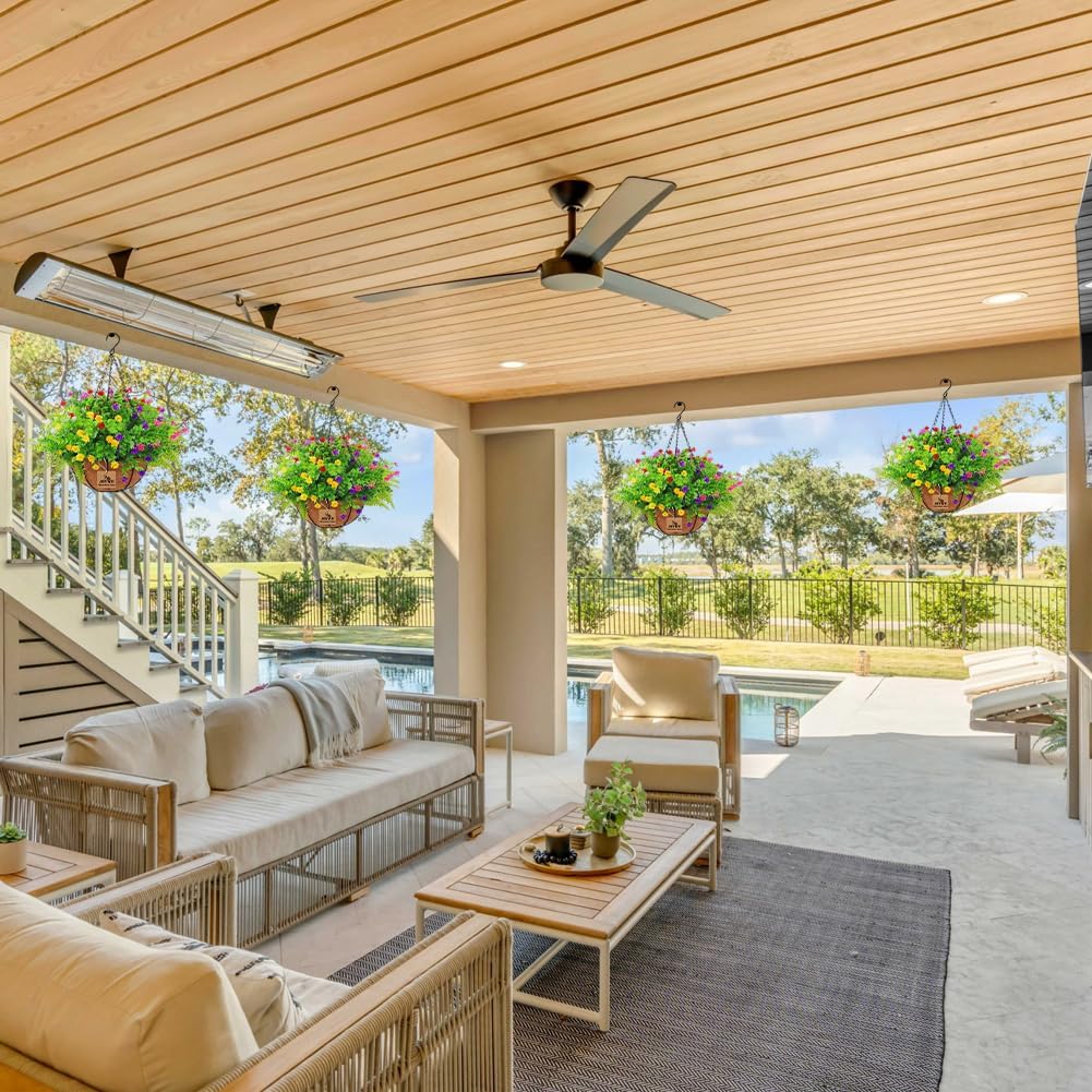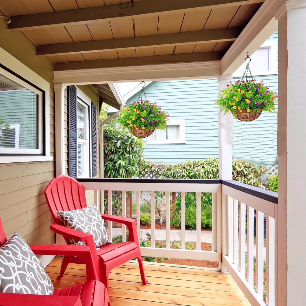Specification: Name:Outdoor Spring Summer Decorarion Artificial Hanging Flowers with Fake Basket Fake Hanging Plants Flowers with Basket Material:Metal,Plastic and Coconut Pot Color:Multicolored Size:44cm/17.3 In Weight:0.6kg Quantity:2 x Artificial Outdoor Flowers with Hanging Basket Features: Outdoor Hanging Basket with Fake Flowers and Plants:This hanging basket with artificial flowers and plants includes 1 pcs coconut lining chain hanging plant basket,artificial flowers and green boston fern UV Resistant and Never Fade:Fake faux greenery plants are UV resistant and never fade, can be put outside, backyard, farmhouse, garden, balcony, window sill or indoor veranda Suitable Size:The diameter of basket is 8 inches/20cm, the whole height 44cm/17.32 in(including hanging chain). Each flower has many flexible branches,you can arrange and bend the flowers as you like freely Wide Application:The fake hanging flower with baskets suitable for outdoor and indoor hanging, such as terraces, decks, gardens, front porches or balconies; These flowers never fade and can add charm to your surroundings year after year Easy to Care: Artificial flowers for outdoors don't need watering or care.The hanging plants artificial decor can decorate your home,there are a range of colorful flowers options available.It looks full and beautiful all spring and summer Product including 2 x Artificial Fake Hanging Plants Flowers Basket for Outdoor