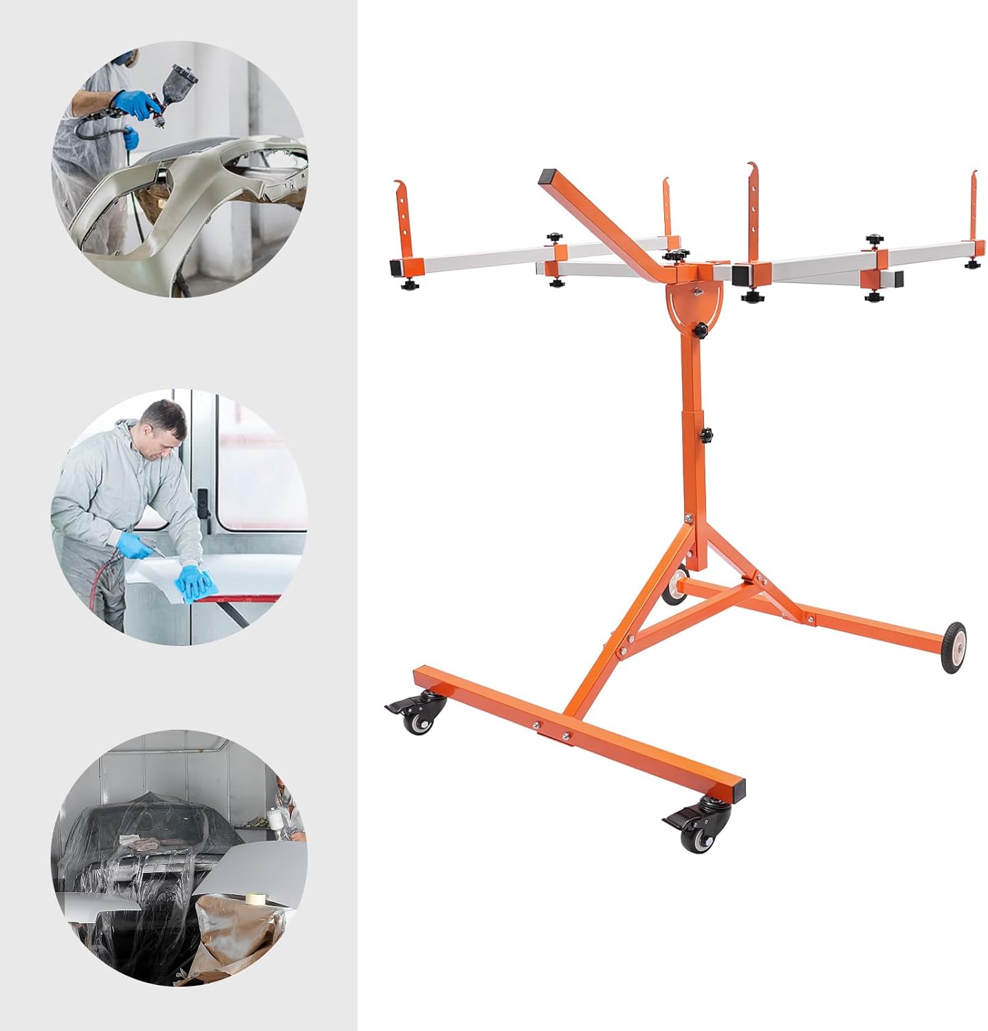 DetailsReady-to-Assemble Holes: These holes are matched to the screws included in the package, letting you assemble the product with less time and effort.Shield Covers: These handy covers block dust, liquids, and debris from getting inside the tubes, helping extend the product’s lifespan.ApplicationThe product is mainly used for painting or repairing light sheet metal and automotive sheet metal such as hoods, wings, and bumpers.SpecificationsColor: OrangeStyle: ModernMaterial: Steel180° Rotatable: YesAssembly Required: YesMount Type: Free StandingProcess: Bending, Welding, Polishing, Pickling, Phosphating, SprayingProduct Overall Size: 90*96.2*115cm/35.43*37.87*45.28inPackaging Size: 93*21.5*12.5cm/36.61*8.46*4.92inGross Weight: 17kg/37.48lbsPackage Included1*Multifunction Paint Stand2*Casters2*Wheels1*English Assembly ManualOther Needed AccessoriesNotes1. Please check the size carefully before ordering.2. Please read the English manual carefully before assembly.3. Please allow the slight color difference caused by the shooting light and 1-3cm error due to manual measurement, and make sure you do not mind before you order.