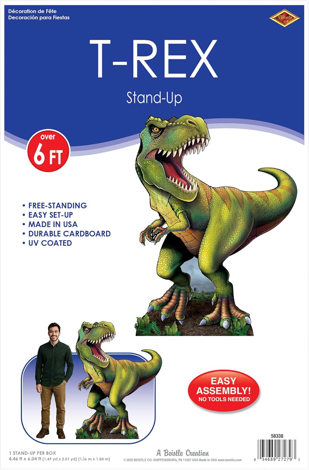 Beistle T-Rex Stand-Up. Proudly Made in the USABring prehistoric excitement to your event with the Beistle T-Rex Stand-Up. Featuring a detailed Tyrannosaurus Rex design with textured scales, bold coloring, and an open roaring stance, this large-format cutout captures the powerful presence of one of history’s most iconic dinosaurs. The dynamic full-body artwork creates an impressive focal point for entrances, stage displays, and immersive themed settings.Measuring approximately 6 feet ½ inch tall by 4 feet 5½ inches wide, this oversized decoration is printed on durable UV-coated cardboard for enhanced color and added structural support. The attached easel allows for easy freestanding setup, and simple assembly is required.Ideal for dinosaur themes, prehistoric displays, museum-style décor, science events, birthday parties, and adventure-inspired gatherings, this T-Rex stand-up adds bold visual impact and larger-than-life character to any space.