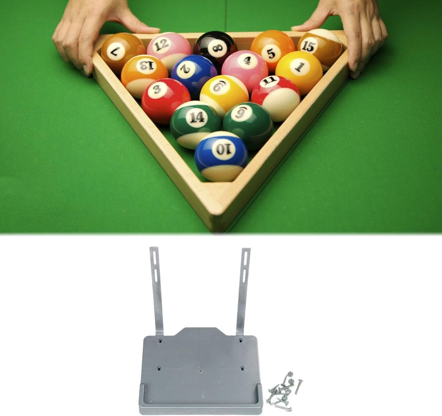 Description: - 【Universal Compatibility】: This billiard triangle rack tray is designed to fit all pool tables, making it a versatile addition to any game room setup - 【Material】: Made from PP and iron materials, this rack tray is resist deformation and cracking, ensuring long term durability - 【Ideal for Various Settings】: Great for use in home game room, bar, pub, and other commercial environments where billiards are played - 【Optimal Dimensions】: With an outer length of 38.5 cm/15.16 inch, inner length of 35 cm/13.78 inch, and width of 30 cm/11.81 inch, this billiard triangle rack tray provides a snug fit for arranging your billiard balls efficiently - 【Complete Package】: The package includes 1 base tray, two support brackets, and a pack screw for easy assembly and secure installation on your pool tableSpecification: - Material: PP IronSize Chart:Outer Length 38.5cm/15.16inch;Inner Length 35cm/13.78inch;Width 30cm/11.81inchPackage Includes:1 Billiard Ball Rack Tray2 Support Brackets1 Pack ScrewNote:Please allow slightly errors 1-2cm/0.39-0.79inch differences due to manual measurement.