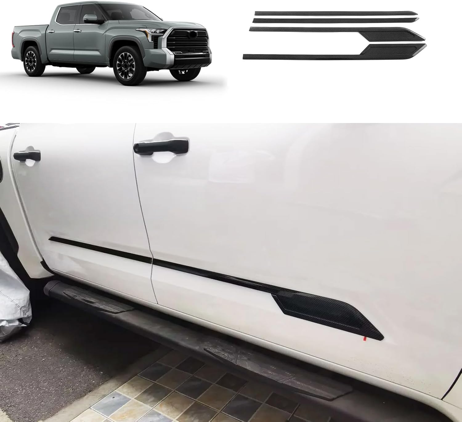 Basic Product Information:Compatible With Toyota Tundra 2022 2023 2024 2025. TIP: Before purchasing a product, please check whether your car model is consistent with the product to prevent buying the wrong product. After receiving the product, be sure to determine where the product will be installed and then compare the product to the installation location. Installation method: (1)Use stickers on the back of items. (2) Clean the surface to be pasted. Keep dry and clean. (3) Please press firmly for at least 2 minutes after installation, especially the edges. (4) If the weather is cold. Please use a hair dryer (hot air) for the best connection. (5) Do not come into contact with water and keep dry for at least 72 hours after installation. Otherwise it will fall off easily. ★Material Type and Product Features: Made of high quality ABS plastic. Color: carbon fiber style,Glossy Black Style. It comes with double-sided tape on the back, you just stick it on the original panel. They show off your charm and accentuate your beloved car. It will give your car a new and unique look in minutes. Package includes: include 4 piece