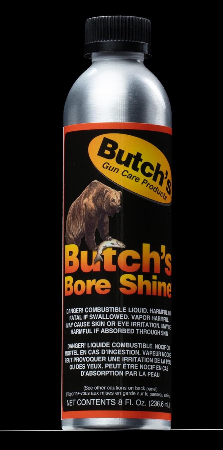 Designed by well known bench rest competitor Butch Fisher, this non-abrasive chemical solvent is specifically designed to remove all forms of bore fouling including copper with an absolute minimum of effort and no damage. It will quickly remove carbon build-up, even in difficult to clean areas like the chamber throat. It also removes lead, wax and even plastic shotgun wad build up. A significant improvement over conventional solvents, Butch's can also control the copper fouling by pushing a few patches soaked with Butch's prior to shooting. Butch's is safe to use on normal and stainless barrels. It is a true "All in One" Cleaner. Try it and you will never use anything else!