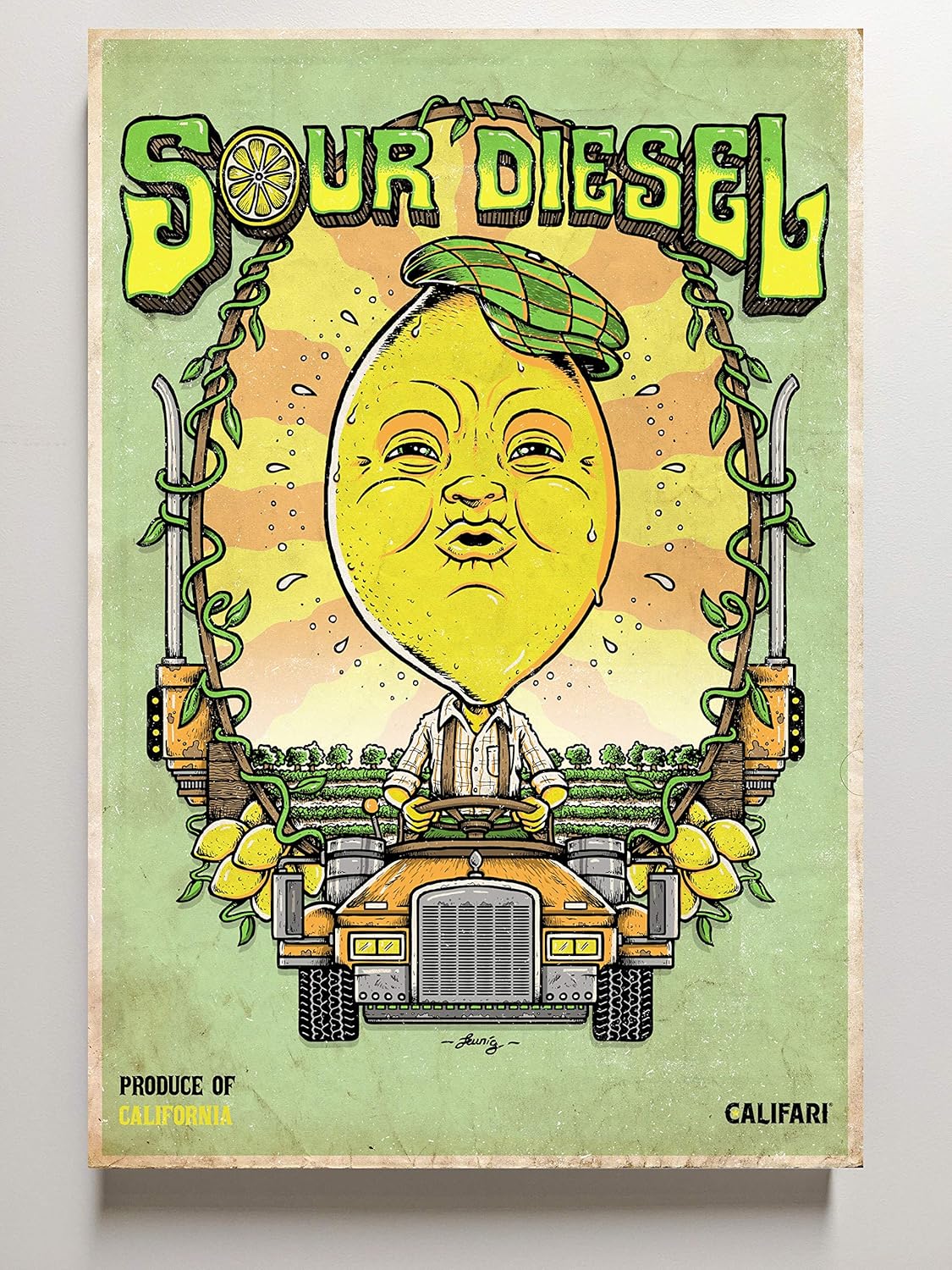 Califari Strain Art Stretched Printed Canvas on Wood Frame 18' x 24' using highest quality wood and giclee printing technques! Califari Califari is on a mission to tell the story and discover the personality of as many strains as we possibly can. We have developed an incredible network of talented artists from around the globe to help us with our impossible task. Reviews and Awards “Utilizing the variety of designers and artists in the strain lifestyle, Califari’s brand has become aesthetically pleasing, approachable, clever, engaging and inclusive.” - Greenstate Awards 2018 Design award for Excellence in Products “Patients would come into the room and have these intense, almost religious experiences with the piece of art that represented their favorite strain,” he told us. ”People yearn for tangible symbols of this most intimate of relationships, and feel joy when they get access to them.” - Steve DeAngelo, Founder and CEO of Harborside