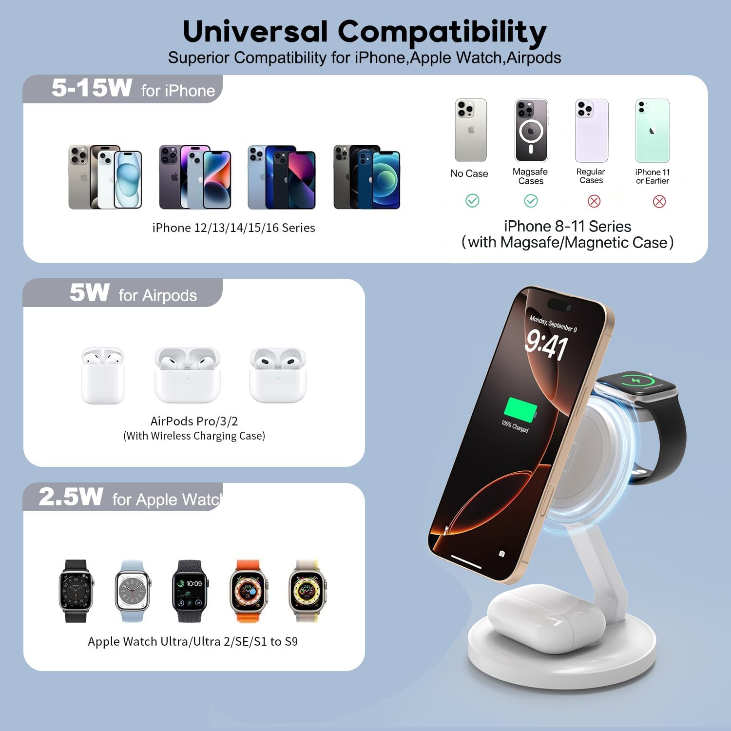 | Compatible Devices | AirPods 2/3 with MagSafe Charging Case,AirPods Pro/AirPods Pro 2 and more, Ultra/Ultra 2/SE/SE 2/10/9/8/7/6/5/4/3/2, iPhone 17/17 Air/17 Pro/17 Pro Max,iPhone 16/16 Plus/16 Pro/16 Pro Max,iPhone 15/15 Plus/15 Pro/15 Pro Max,iPhone 14/14 Plus/14 Pro/14 Pro Max,iPhone 13/13 Pro/13 Pro Max/13 mini,iPhone 12/12 Pro/12 Pro Max/12 mini,iPhone 8-11(with Magsafe case) |
