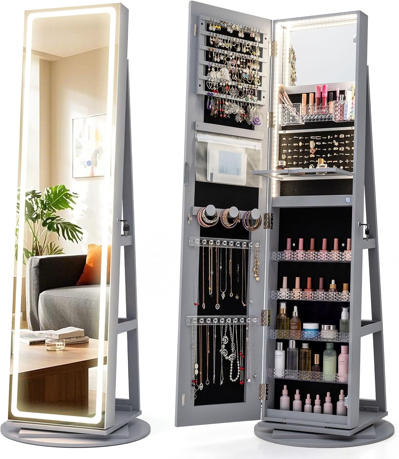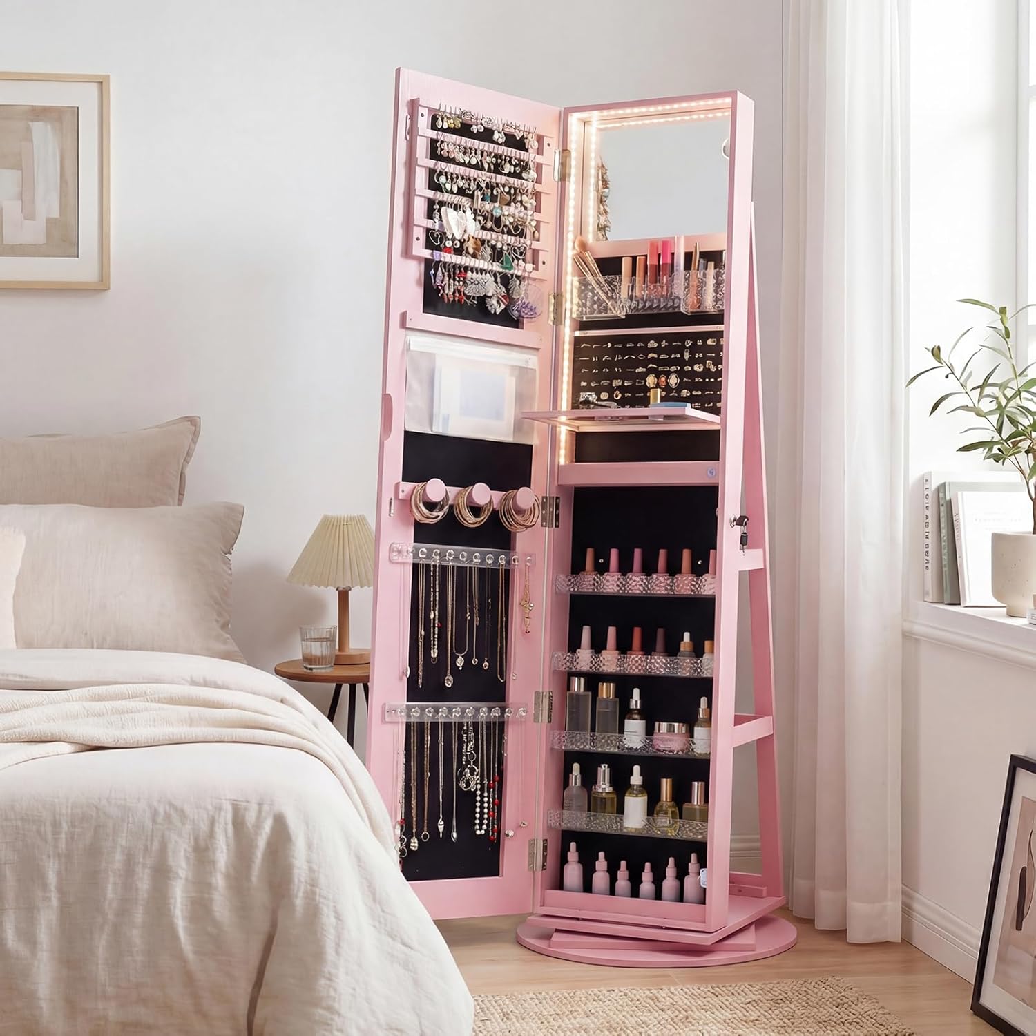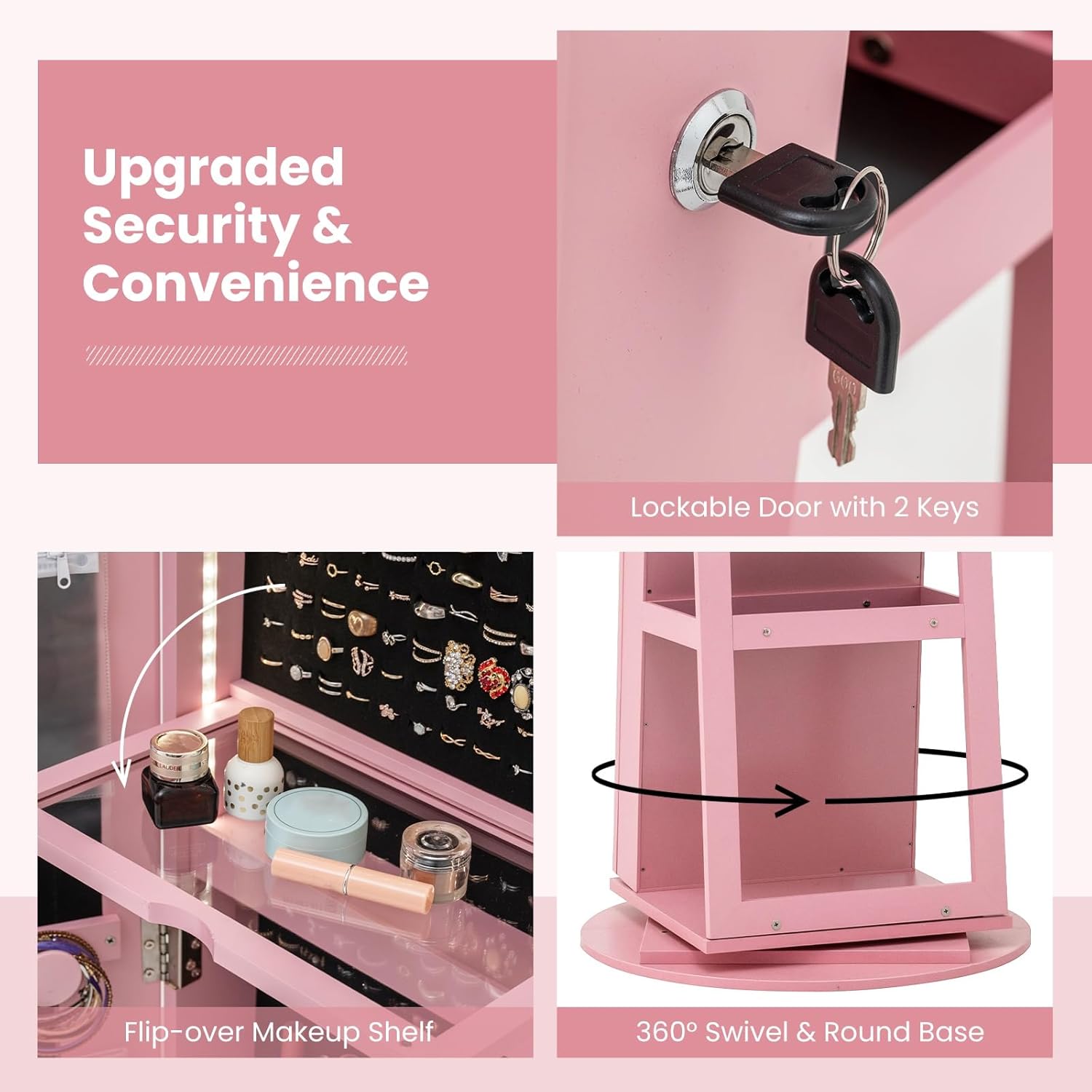 Description: Say hello to a clutter-free and organized dressing space with this standing jewelry cabinet! This standing jewelry organizer comes with large and classified storage space. From earrings and necklaces to bracelets and rings, everything can be neatly displayed and easily accessible. The outside of the jewelry cabinet boasts a full-length mirror, while the inside features a makeup mirror. What's more, there are 3-color LED lights surrounded by both mirrors, which are powered by 4.9 ft power adapter (included). Adjustable brightness meets personal requirements. To ensure the security of your valuable belongings, the jewelry cabinet is lockable. Besides, thanks to the flexible 360° swivel design, you can take items you've stored backside the jewelry armoire at any angle. Features: Multiple storage partitions organize your jewelry with ease 3-color LED lights inside and outside the cabinet offer optimal lighting Short press the touch button to adjust the color, long press to adjust brightness Get a complete view of your outfit with the full-length mirror Lockable jewelry armoire keeps your belongings secure Magnetic catch keeps the cabinet door closed tightly 360° swivel & round base with no blind corner Easy to assemble with detailed instructions Specifications: Color: Pink Material: MDF, Glass, Acrylic Product Dimension: 21.5" x 63" (Dia x H) Full-Length Mirror Size: 14.5" x 61" (L x W) Thickness of Cabinet: 4" Length of Power Adapter: 4.9 ft Net Weight: 52.5 lbs Package Includes: 1 x Jewelry Cabinet 2 x Keys 1 x Pack of Accessories 1 x Instruction