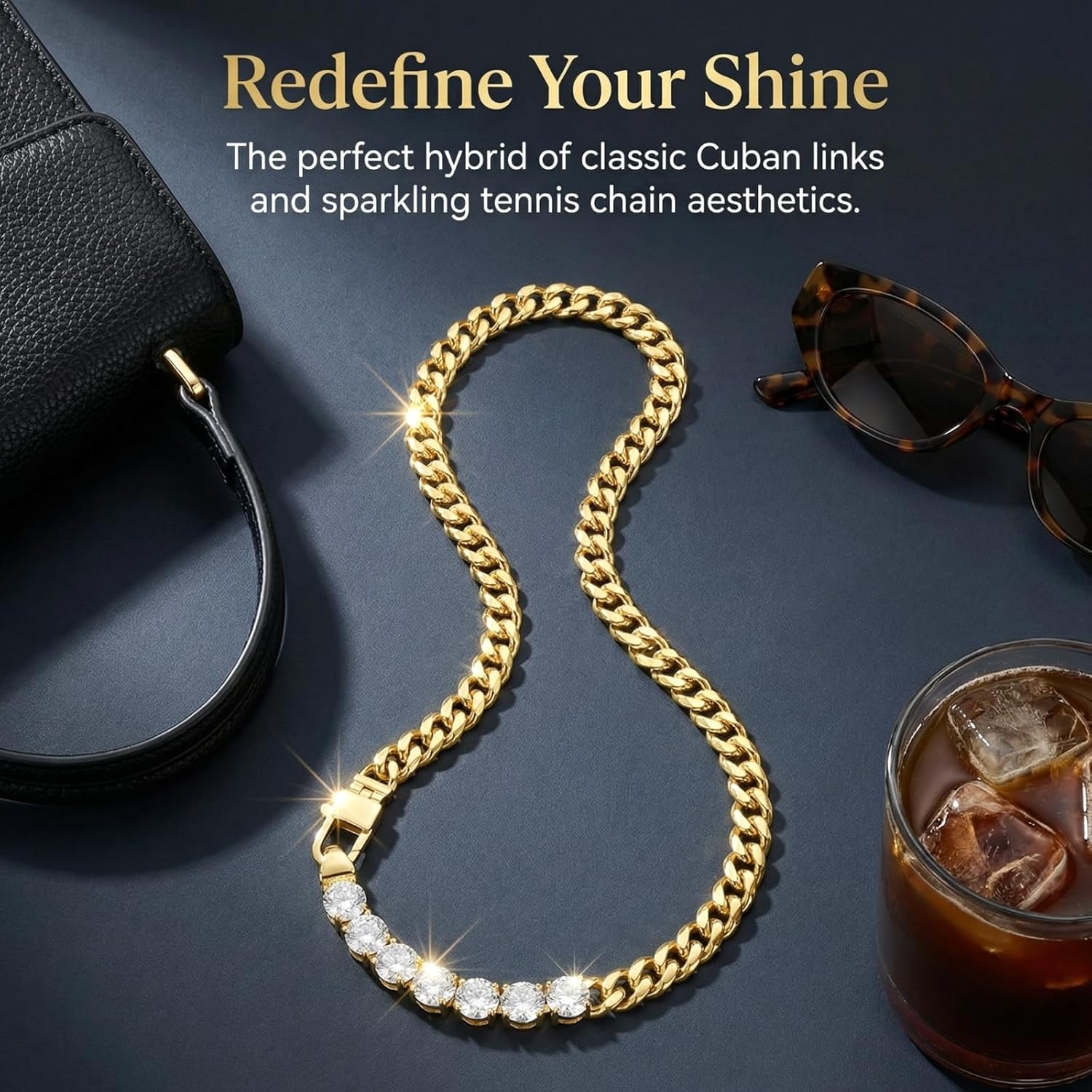 Redefine Your Shine with Our Chunky Cuban Link Tennis NecklaceElevate your jewelry collection with this stunning hybrid necklace that merges the bold appeal of Cuban links with the refined sparkle of a tennis chain. Designed for the modern woman, this piece combines luxury and durability in one exquisite accessory.Crafted from high-quality brass and finished with a thick 18K PVD gold plating, this necklace is not only beautiful but also built to resist water, rust, and fading. The 6mm wide chain feels substantial yet comfortable, while the 7 hand-set zircon stones (each 6mm) catch the light with every movement, offering a diamond-like brilliance without the luxury price tag.Measuring 18 inches in total length, this necklace rests elegantly at the collarbone, making it versatile enough to wear with a casual tee or a sleek evening outfit. It’s the perfect chunky chain necklace for women who love to make a statement.Why You’ll Love It:Timeless Design: A perfect blend of Cuban link and tennis chain styles.Lasting Shine: PVD coating ensures your necklace stays golden and gorgeous.Thoughtful Gift: Presented in a beautiful gift box, ready to delight her.Care Instructions:To maintain its luster, avoid contact with water, sweat, perfumes, or chemicals. Gently wipe clean with a soft cloth after wear and store separately in a dry jewelry pouch or box.Add this exquisite chunky gold necklace to your cart today and redefine your shine—or share it as a beautiful gift for someone special.