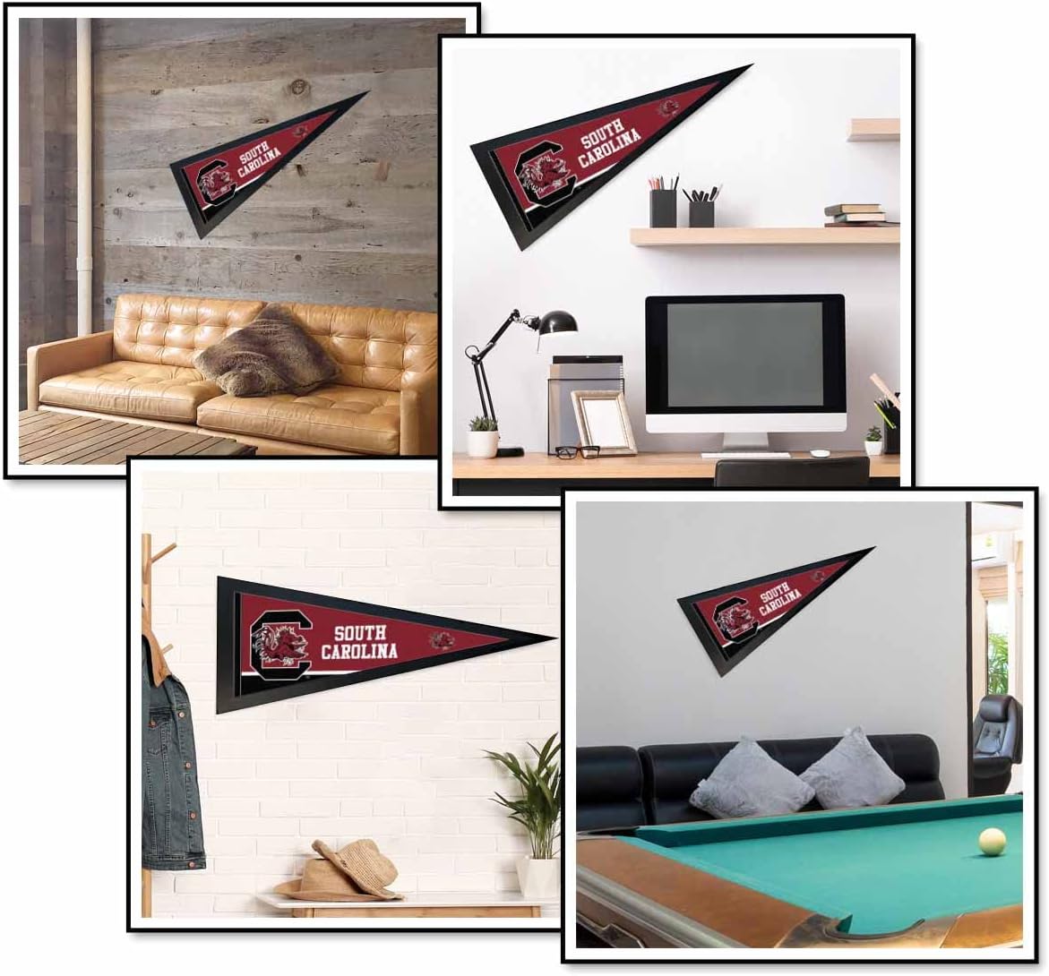 University of South Carolina Pennant and Wood Pennant Frame includes a 12x30 inch soft poly felt Officially Licensed pennant and the recommended Pennant Frame which is made of solid poplar wood.The pennant is full size, single sided screen printed, and is ideal to display on any wall of your home, office, gameroom, or as a banner. The Pennant Frame is 13.25 x 34.25 inches, made of poplar wood moulding, stained black satin, includes a plexiglass front, and fits this pennant perfectly. Please Note: The pennant frame has a protective plastic film on both sides of the plexiglass. Please peel off from both sides when ready to use.