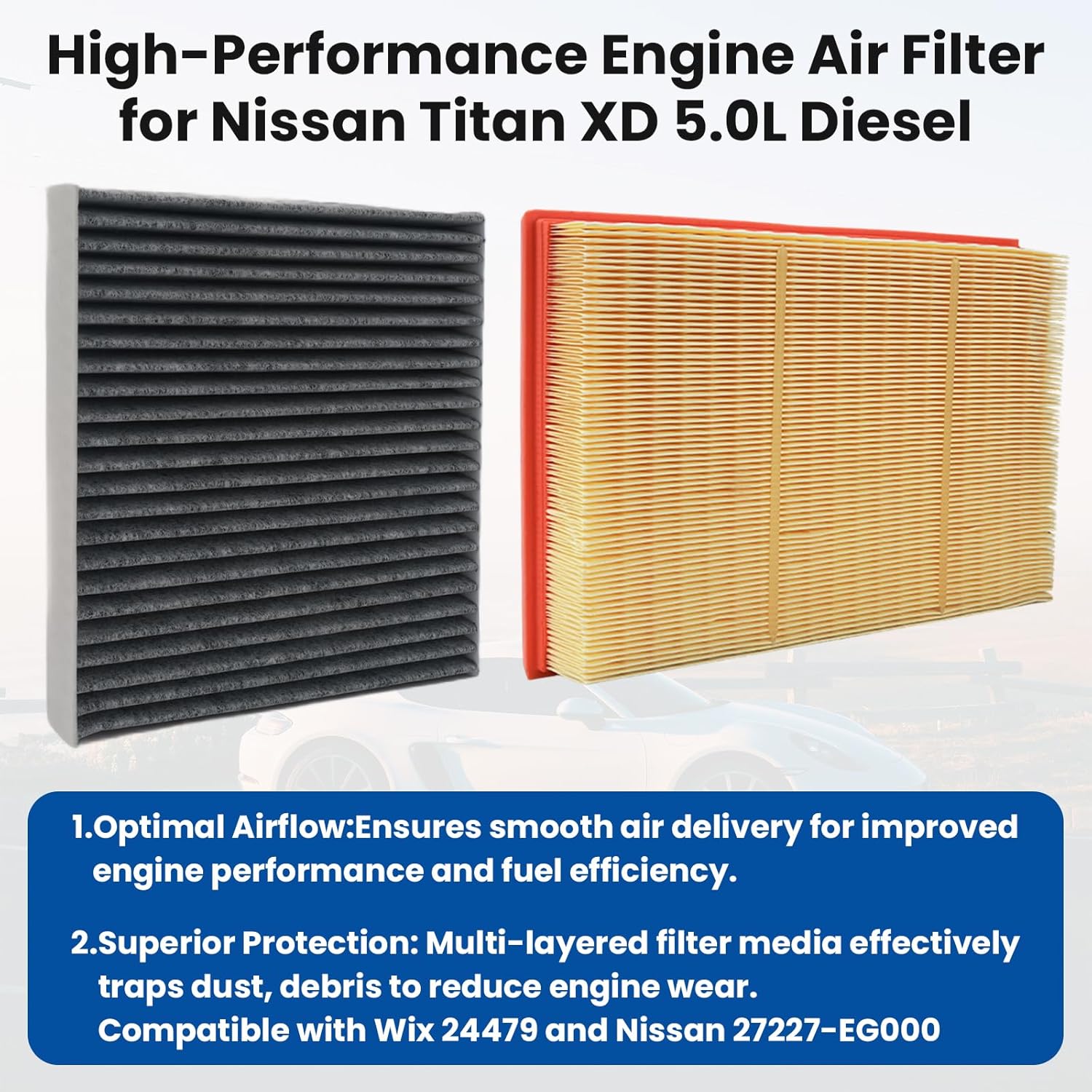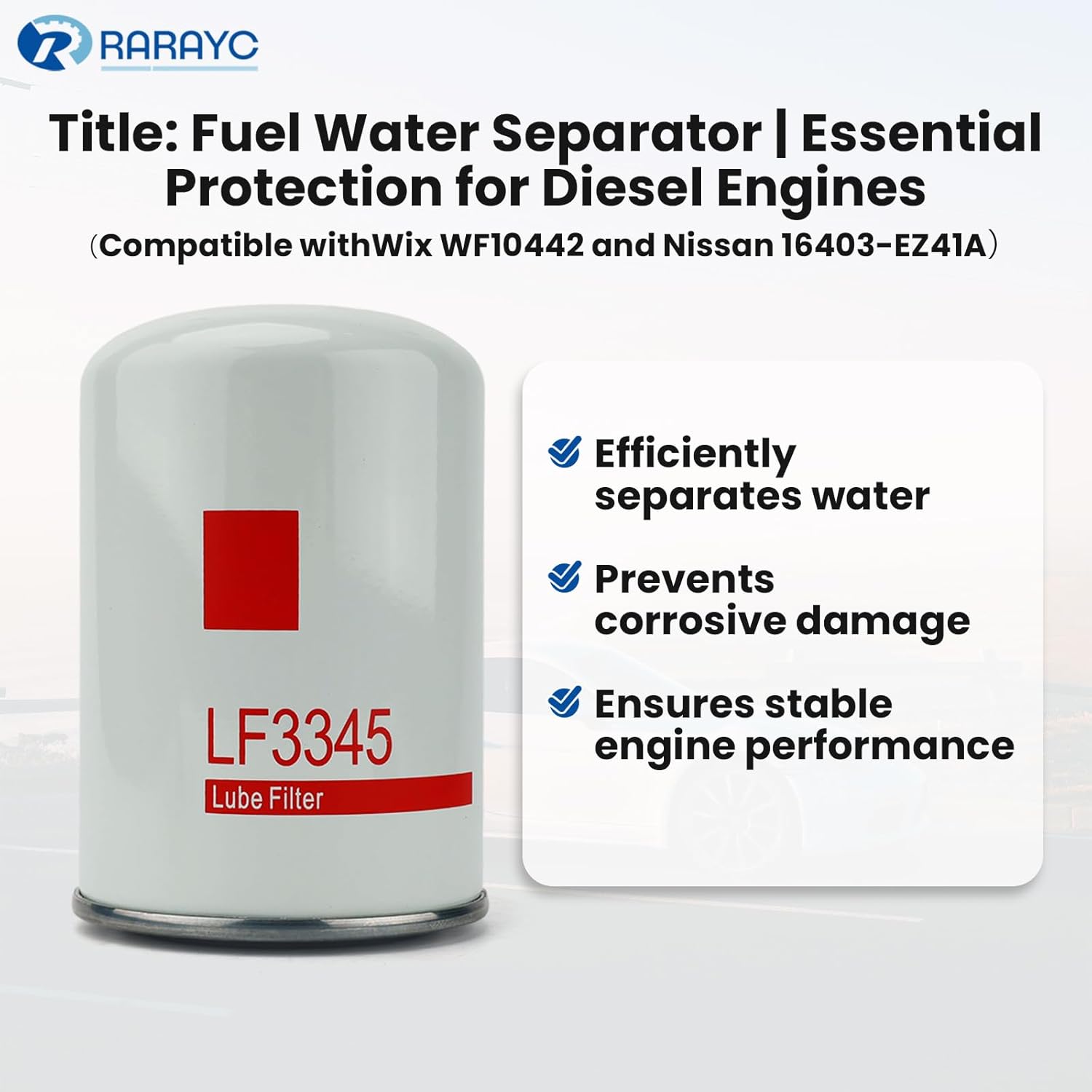 This complete RARAYC diesel filter combo kit provides everything you need for a full service, including an Engine Air Filter (compatible with Wix WA10437 & Nissan 16546-EZ40A), a Cabin Air Filter (compatible with Wix 24479 & Nissan 27227-EG000), an Oil Filter (compatible with Nissan 15208-EX40A), a Fuel Filter (compatible with Wix WF10441 & Nissan 16403-EZ40A), a Fuel Water Separator (compatible with Wix WF10442 & Nissan 16403-EZ41A), and 2 complimentary O-rings. Designed as a perfect replacement for the 2016-2019 Nissan Titan XD, this integrated set ensures optimal performance and protects your vehicle's critical systems.Engineered with high-quality materials, each filter is built to exceed expectations. The Oil and Fuel Filters work in tandem to capture harmful contaminants, significantly reduce engine wear, and improve fuel economy. Meanwhile, the Cabin and Engine Air Filters ensure a dual defense—trapping dust, and debris to provide cleaner cabin air for a healthier ride and maintaining optimal engine airflow for efficient combustion. The Fuel Water Separator adds a crucial layer of defense by efficiently removing water and impurities from diesel, preventing corrosion and enhancing the overall reliability of your fuel system in all conditions.We stand behind the quality and compatibility of our filter kit with confidence. Every component is precision-designed for a perfect fit and easy installation on your Nissan Titan XD, making your maintenance routine quick and hassle-free. Your satisfaction is our priority, which is why we support your purchase with responsive customer service and a solid 1-year warranty, ensuring a trusted and reliable solution for your vehicle.