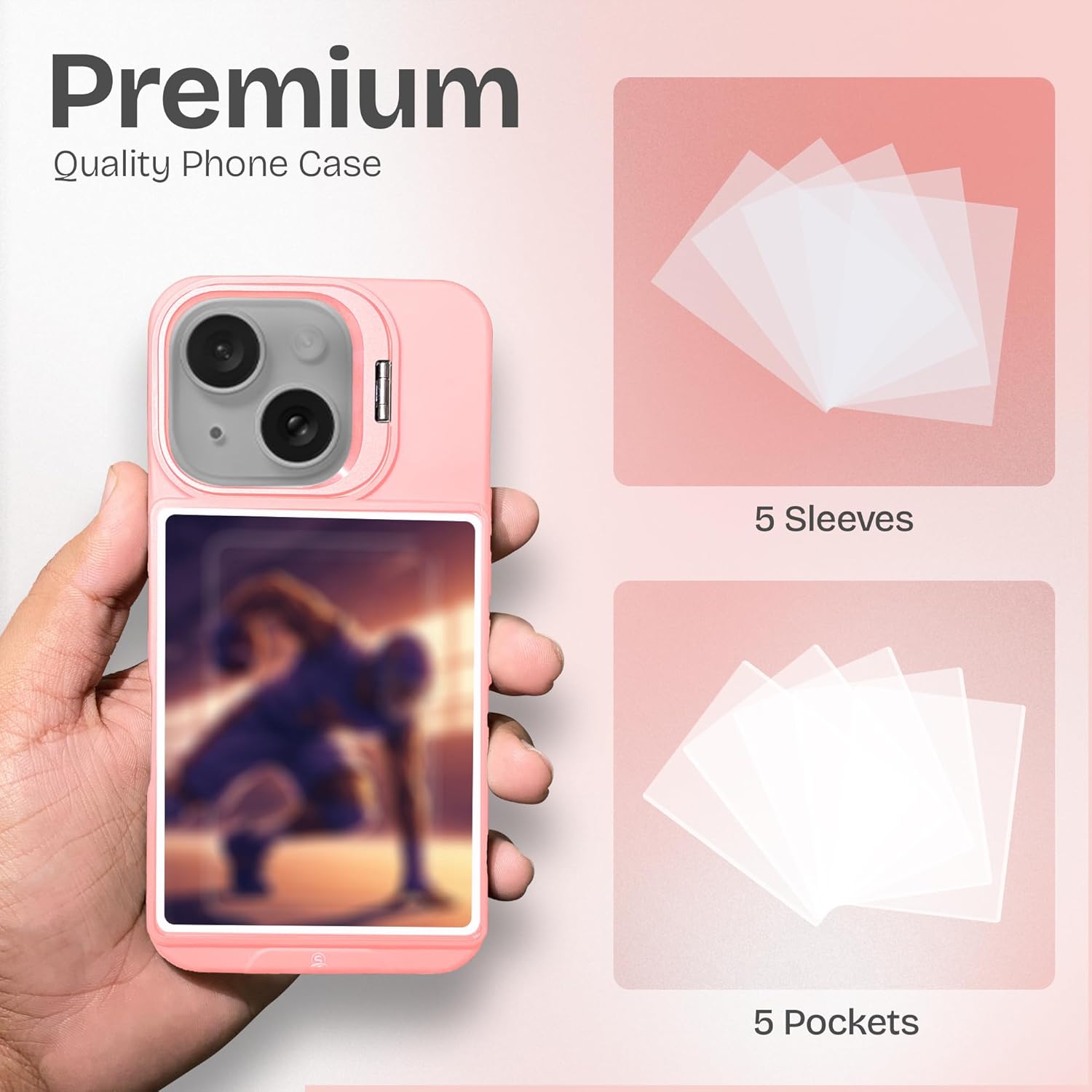 Display Phone Case for iPhone 13 & 14 |Protective Cards Phone Case with Built-in Camera Stand + 5 TCG/Photo Display Top Loaders & Sleeves|Compatible with Pokémon, Yu-Gi-Oh and Magic Collectors (Pink)