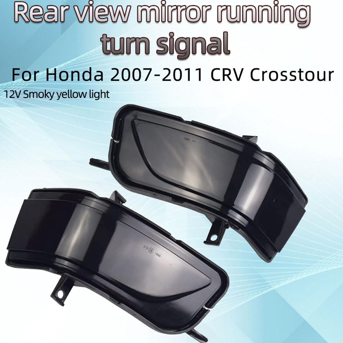 Description: Listing includes: 2 × Rearview mirror light ( Left and Right) Water Flowing Dynamic Turn Signals Installation: Just need to remove your original light and install our Aftermarket LED Light Housing color: Smoked Black Light color: Yellow Long lifespan, More Safety, 100% Waterproof Note: Installation Instruction is NOT included. Fitment: Compatible For Honda CRV CR-V 2007-2011 Compatible For Honda Crosstour 2012-2016 Note: Original Side Mirror Caps Must Come With Light! Important notice before purchase 1. Confirm the year and model of your car to check if it fit for our item. 2. Confirm your original light shape and size. 3. Confirm your original light power interface / plug same with our item.