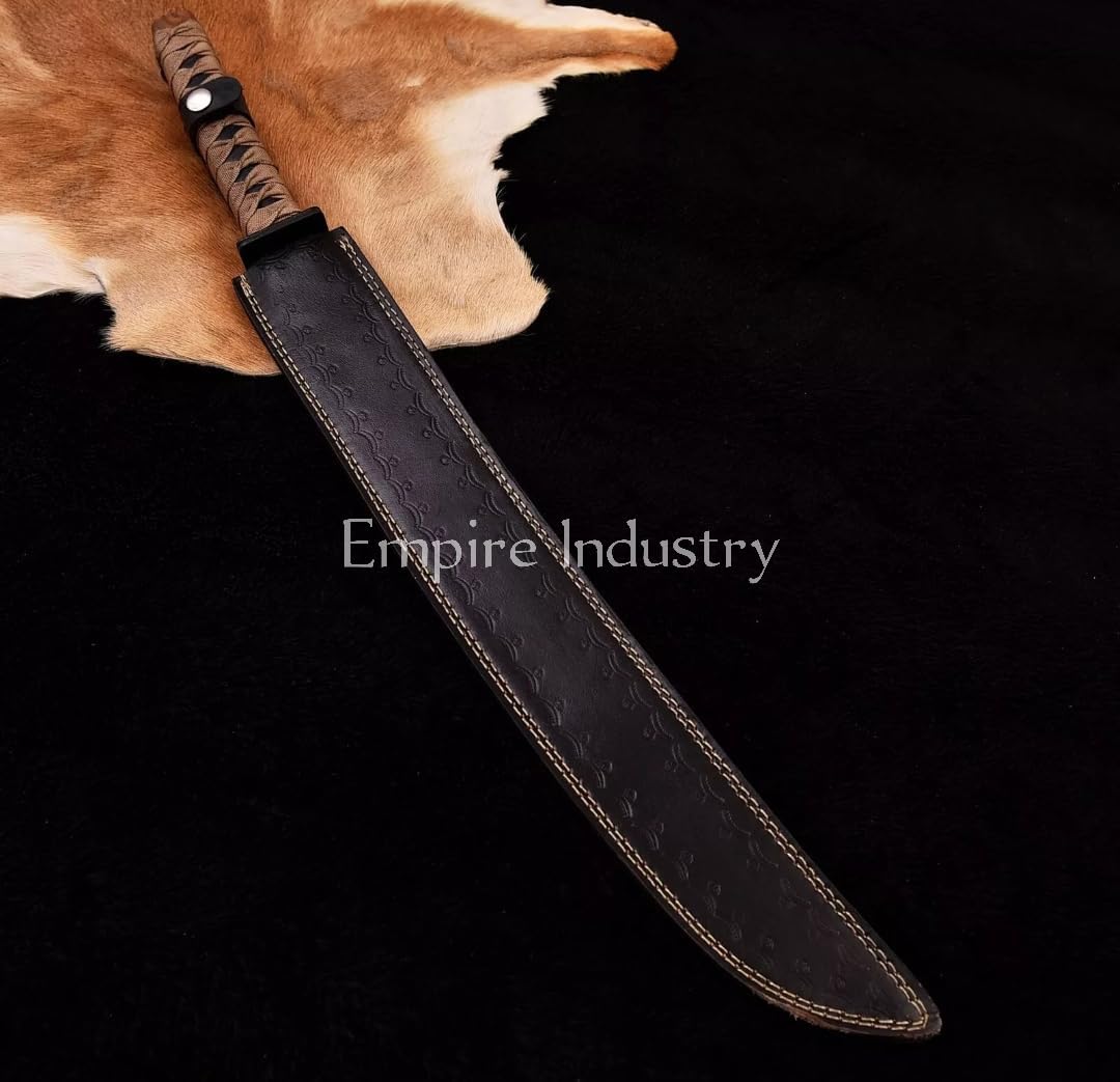 We Also Accept Custom OR Bulk Quantity Orders. Specifications Handmade J2 Steel Hunting Sword With Leather Sheath By Empire Industry. HANDLE MATERIAL AWESOME Leather Wrapping On Micarta Grip With Steel Guard. Overall Length: 27.00 Inches Blade Length: 20.00 Inches Handle Length: 7.00 Inches. Blade Thickness: 3 - 4 mm J2 Steel Blade Having Sharp Edges. Hardness Of The Blade Is 57-60 HRC. SHEATH Well Hand Stitched Cow Hide Leather Sheath QUALITYSTANDARDS Our Damascus blades are made from high quality non-stainless steels which rival or exceed any Damascus blade made from the 10 series with 15N20.Our Damascus combination has taken years to perfect and has been tested under a variety of application which will offer professional performance in categories of toughness, strength (lateral stress) and edge honing and holding ability. And No two blades are exactly same because of its unique pattern. In a 5 spot Rockwell test our blades will average near or close to 58 which offers a perfect balances between its toughness and strength. Our blades due to carbon content need to be regularly treated with wax and/or 3 in 1 oil to maintain its superior quality. Questions If you have any question feel free to send us message we aim to answer all questions within 12 hours. Feedback If you are not satisfied with our service please contact us before leaving any negative or natural feedback. We will resolve all issues as quickly as possible. Disclaimer We are not responsible for any injuries associated with the use of our tools. Our products are intended for legal use only by responsible buyers. Therefore, we will not sell our products to anyone under the age of 18.