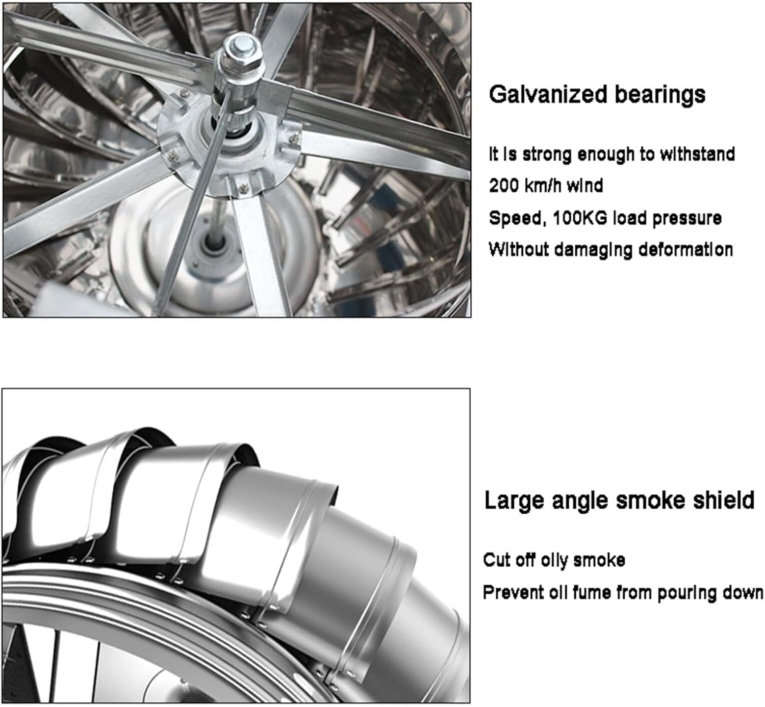 Chimney Spinner Pot Cap, Rotating Ventilator Cap, Stainless Steel Spinning Ventilation Chimney Cowl Rotating Chimney Cowl CapProduct name:Rotating Chimney CowlMaterial:304 stainless steelHigh temperature resistance up to 450 ° C.Welding technique:plasma weldingProduct Quantity: 1 setPrecautions:Installation location should maintain good ventilation and avoid obstructing airflow. Regularly check the rotational flexibility and fixation of the cap to loosening or damage. Check whether there is any foreign matter stuck in the cap to ensure normal operation.so that the air in your home is smoother.