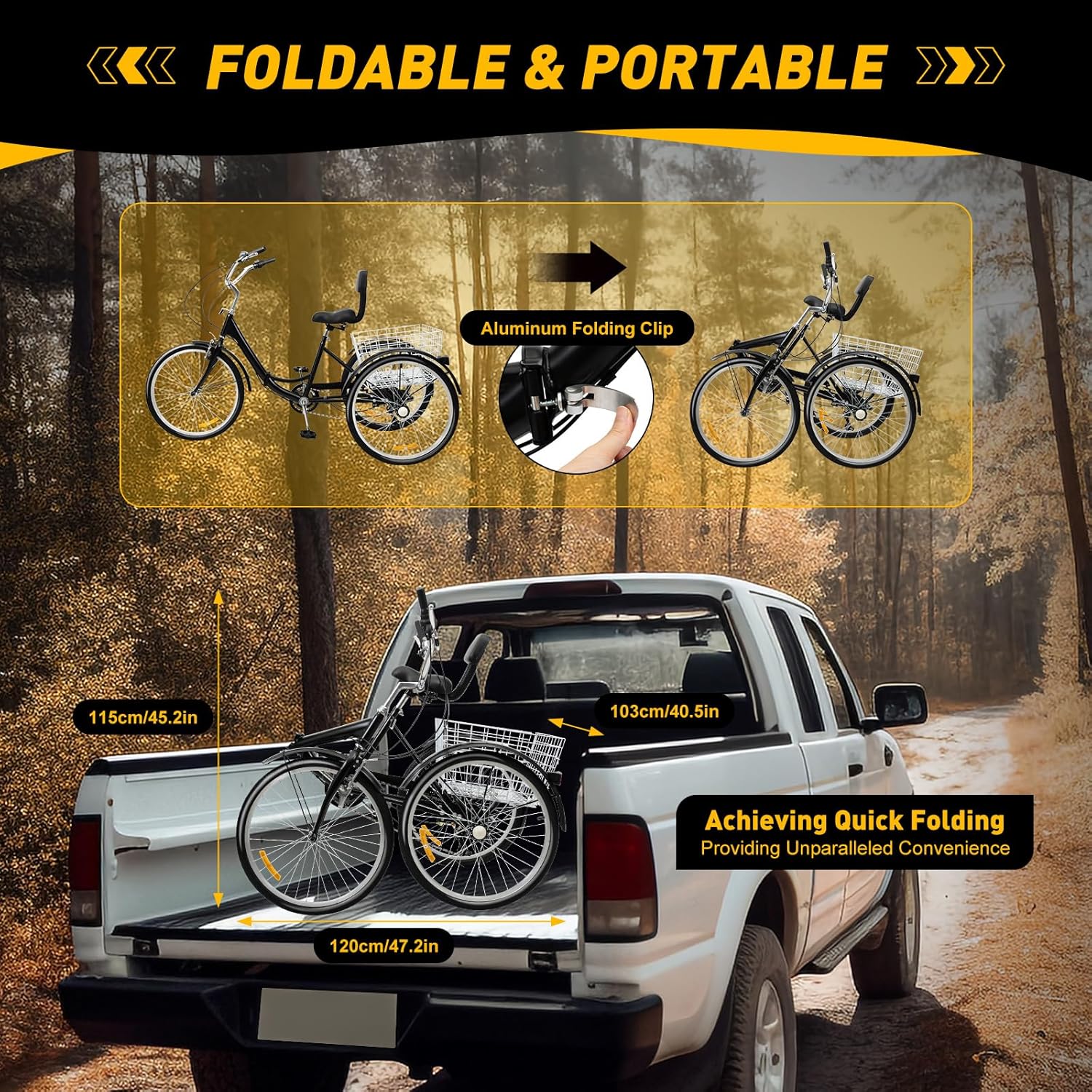 DescriptionYou can enjoy leisurely free time in the city, at the beach, and on the street with this tricycle. This product has superb stability with its sturdy triangle structure, and it can satisfy the elderly or people who need more stability due to physical factors. It also allows you to keep healthy while conveniently storing food and supplies in the back basket.DetailsFenders: The fenders prevent mud and water from splashing on the wheels and staining your clothes.Large Tires: Tires with the size of 24 inches have a larger ground contact area, thus providing greater grip to ensure your riding safety.ApplicationThis product is suitable for all kinds of road surfaces, such as concrete, asphalt, and soil. The 24" size is suitable for men, women, elder people, and adults who weigh less than 209.44lbs and are 62.99 to 70.87inches tall.SpecificationColor: BlackAge: AdultMaterial: High Carbon Steel, Rubber, AluminumProcess: Electrostatic Baking PaintNumber of Wheels: 3Transmission Gear: 7 GearAssembly Required: YesCushion Load: 95kg/209.44lbsStorage Basket Load: 25kg/55.12lbsWheel Diameter: 61cm/24inSuitable Body Height: 160~180cm/62.99~70.87inBasket Size: 55*45*28cm/21.65*17.72*11.02inArmrest Distance: 80cm/31.5inSeat Adjustment Height: 75-92cm/29.5-36.2inProduct Size: 170*70*103cm/67*27.5*40.5inRear Wheel Width: 73cm/28.74inGross Weight: 29.55 kg/65.15 lbsPackage Size: 30.5*65.5*107 cm/12*25.79*42.13inPackage Included1 * Adult Tricycle1 * English ManualAll Accessories for InstallationNotesPlease allow the slight color difference caused by the shooting light and the 1-3 cm error due to manual measurement, and make sure you do not mind before ordering.