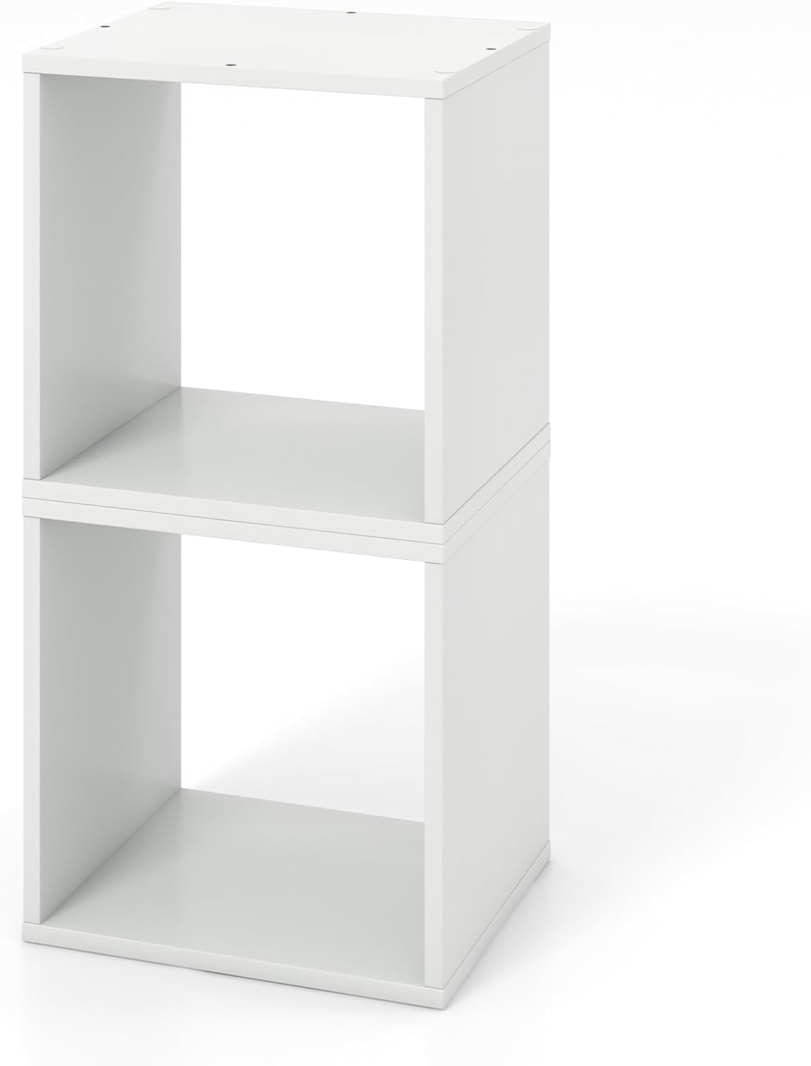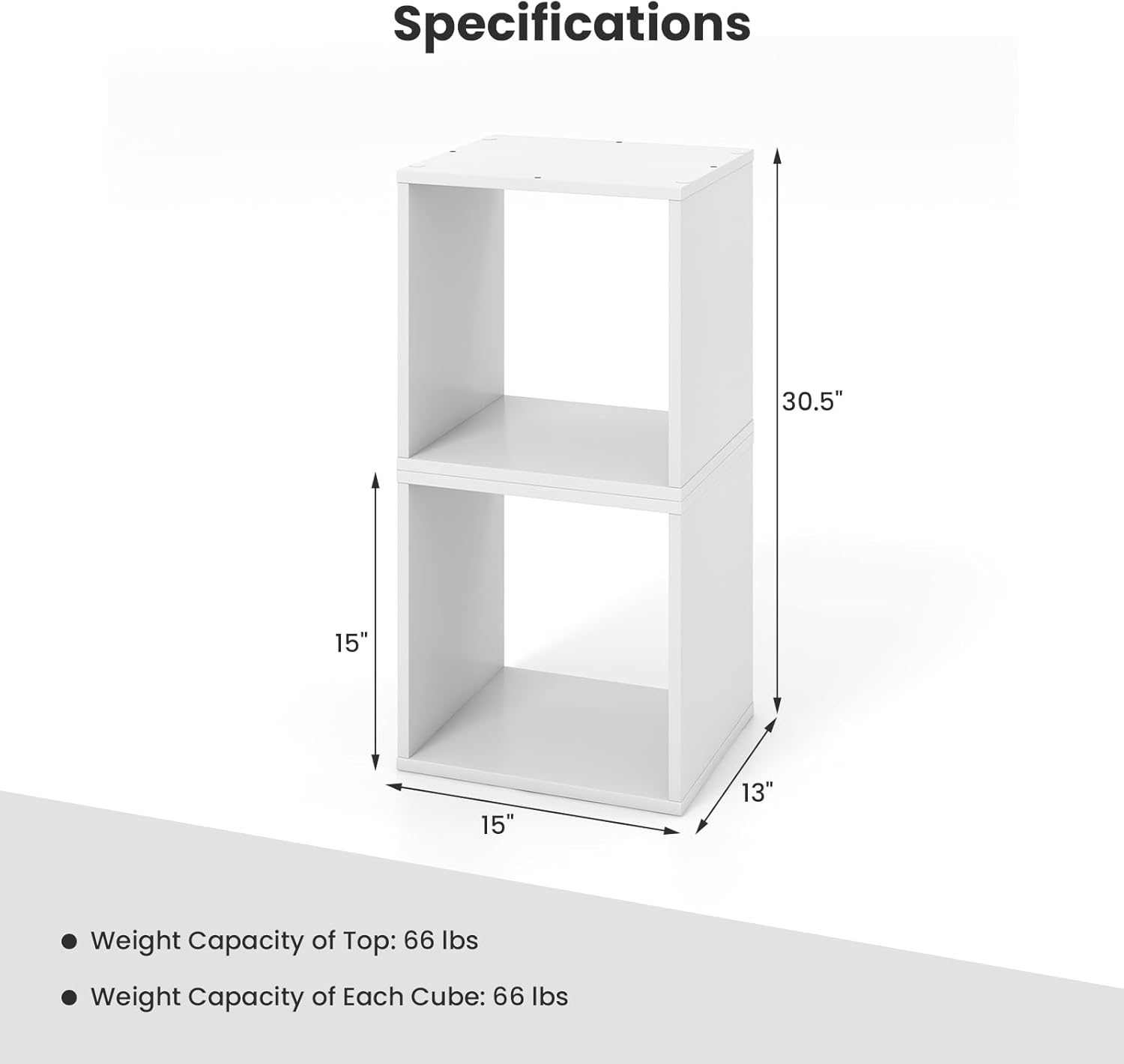 Description: Experience the convenience of our free stacking cubes! Giantex freestanding book case includes two separate cubes that can be placed horizontally or vertically. You can also combine multiple sets of cubes to create a storage wall that fits your needs. The cubes are made of high-quality boards and each can hold up to 132 pounds. Details of the storage cubes showcase good workmanship: non-slip foot pads add extra stability and the beautify stickers make the cubes look great. In addition, anti-toppling devices ensure the safety of your family and pets. These cubes are stylish and can be used as storage cabinets, nightstands, sofa side tables, or even record organizers! Features: Functional stacking cubes can keep your room free of clutter You can stack 2 cubes horizontally or vertically Multiple sets of cubes can be used to create a storage wall Made of high-quality boards, each cube can hold up to 132 lbs Anti-toppling devices for added safety of the family with kids or pets Smooth and water-proof surface is easy to clean Stylish shelves can be used as storage cabinets, nightstands or sofa side tables Specifications: Color: White Material: Engineered Wood Overall Dimension of Each Cube: 15” x 13” x 15” (L x W x H) Interior Size of Each Cube: 14” x 13” x 14” (L x W x H) Net Weight: 22.5 lbs Weight Capacity of Top: 66 lbs Weight Capacity of Each Cube: 66 lbs Package Includes: 2 x Cube Bookshelf 1 x User Guide
