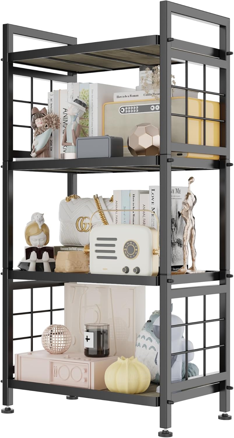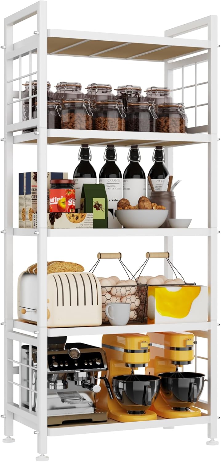 GIOTORENT 5-Tier Hybrid Storage Shelf: Where Industrial Strength Meets Farmhouse CharmTransform your space with our premium storage solution featuring sturdy wooden boards over reinforced steel grids – engineered to outperform ordinary wire shelves. This smart upgrade delivers 30% greater load capacity (120 lb/shelf), prevents small items from falling, and adds warm wood elegance to functional storage.Heavy-Duty Performance You Can Trust:Commercial-Grade Steel Frame with triple-layer rustproof coating withstands kitchen steam, bathroom humidity & laundry room splashesUnshakeable Stability: Industrial screw-nut joints (no plastic clips!) + adjustable anti-tip feet conquer uneven floorsReal-Life Capacity: Holds 6x 25-lb bags of flour per shelf – perfect for pantry stockpilingSpace-Smart Versatility:Slim 16.9”D x 12.7”W x 53.5”H profile fits:Apartment kitchens (holds microwaves + cookbooks)Closet corners (shoe/accessory storage)Tight bathroom spaces (towels + toiletries)Style That Elevates Your Home:The black powder-coated frame features our signature #-shaped side design – blending rugged durability with modern farmhouse aesthetics. Natural wood shelves create a decorative accent that complements: Rustic kitchens Minimalist bathrooms Industrial loftsWorry-Free Package Includes:All hardware + visual assembly guideDedicated US support (24hr resolution guarantee)Exceptional Gift-Ready Value – surprise new homeowners with stylish, heavy-duty storage