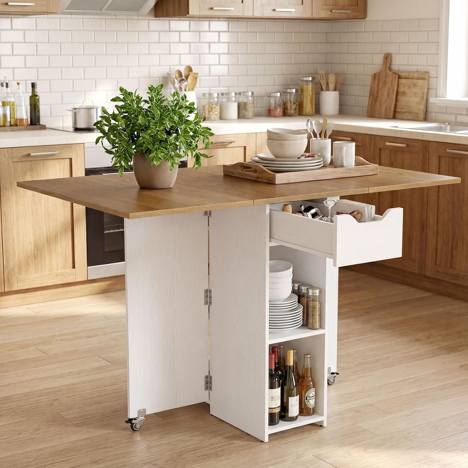Description:The folding dining table is thoughtfully designed to bring versatility and organization to small homes. Its dual drop-leaf panels allow the table to shift seamlessly from a compact form to a full dining setup, making it ideal for apartments or limited spaces. With 2 open shelves and a built-in drawer, this kitchen table helps keep dining essentials neatly stored and accessible. In addition, equipped with 2 lockable universal wheels and flexible hinges, it supports smooth adjustments for meals, studying, or hosting guests. The wear-resistant surface is easy to clean, while the solid construction ensures dependable daily use.Features:Folding design with dual drop-leaf panel makes full use of limited spaceThe drawer and 2 open shelves keep items organized and accessibleFlexible metal hinges support easy transitions between configurations2 lockable universal wheels for easy movement and stabilityThe tabletop holds up to 88 lbs for reliable daily useEach shelf can support up to 22 lbs for daily essentialsIt functions as a dining table, writing desk, or console tableLarge wooden tabletop offers a smooth and easy-to-clean surfaceAssembly is neededSpecifications:Color: Rustic Brown & Black/Natural & White/Grey Oak & BlackMaterial: Engineered Board, MDFProduct Dimensions (Fully Expanded): 47.5” x 28.5” x 29.5”/120 x 72 x 75 cm (L x W x H) Product Dimensions (Half Expanded): 31.5” x 28.5” x 29.5”/80 x 72 x 75 cm (L x W x H) Product Dimensions (Fully Folded): 16” x 28.5” x 29.5”/40 x 72 x 75 cm (L x W x H) Tabletop Weight Capacity: 88 lbs/40 kgEach Shelf Weight Capacity: 22 lbs/10 kgNet Weight: 55 lbs/25 kgPackage Includes:1 x Extendable Dining Table1 x User’s Manual