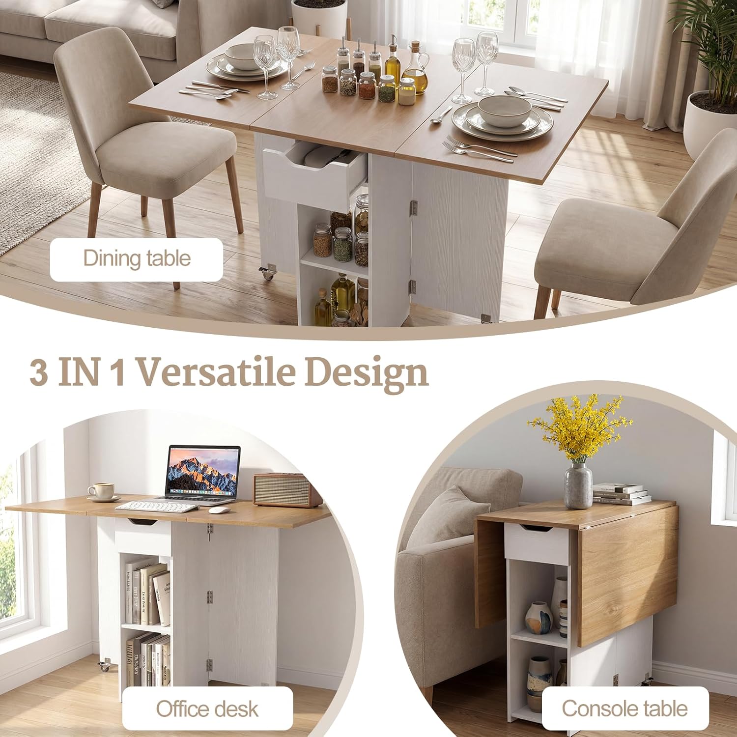 • 3-in-1 Versatile Design: Designed for flexibility, this versatile table easily converts between a full dining table, a half-open office desk, or a compact console table. In addition, its chic appearance fits perfectly in kitchen, dining room, study, entryway or bedroom, adapting to your different daily needs.