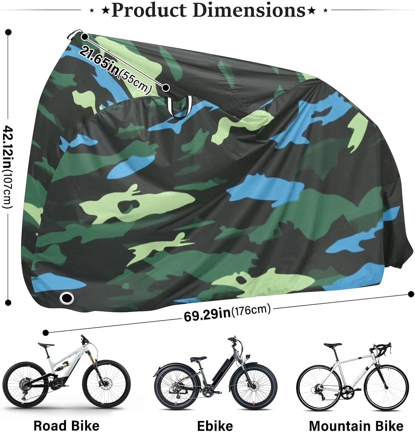 Size: 176*107*55CM/69*42*21.6Inches. Cover for Bike is suitable for road bikes, electric bikes, mountain bikes, etc. Before purchasing, please be sure to measure the length, width and height of the first to avoid buying the wrong size.Material: Umbrella waterproof fabric. Cover for Bike has strong tear resistance and can effectively deal with some extremely complex weather conditions, providing comprehensive protection for your .Product Functions: Outdoor Bike Cover can effectively physically cool down, block direct ultraviolet rays, and has excellent shading, heat insulation and sun protection effects. Rainy days can prevent the car body from getting wet by rainwater.Product Design: There is a reserved lock hole at the front wheel position, which can facilitate locking the vehicle. Bike Covers Outdoor are buckles at the rear wheel position to secure the cover and prevent it from moving.Outdoor Accessories: This Bike Cover provides a protective guarantee for your beloved car and is an essential accessory for outdoor camping. It can also be given as a present to your fellow colleagues and friends.