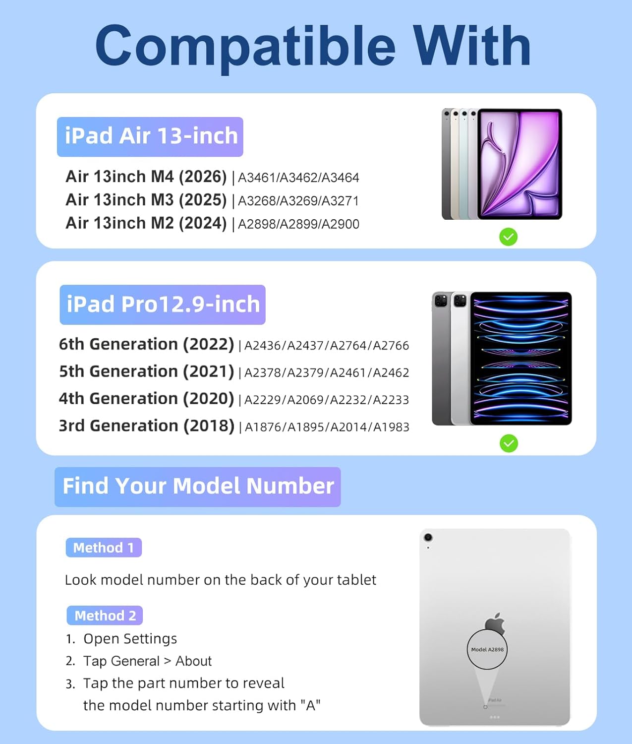 | Compatible Devices | Compatible with iPad Air 13 inch (M4) 2026 (Model Number: A3461, A3462, A3464), Air 13 inch (M3) 2025 (Model Number: A3268, A3269, A3271), Air 13 inch (M2) 2024 (Model Number: A2898, A2899, A2900), Compatible with iPad Pro 12.9 inch 3rd Generation 2018(Model Number: A1876, A1895, A2014, A1983), Compatible with iPad Pro 12.9 inch 4th Generation 2020(Model Number: A2229, A2069, A2232, A2233), Compatible with iPad Pro 12.9 inch 5th Generation 2021(Model Number: A2378, A2379, A2461, A2462), Compatible with iPad Pro 12.9 inch 6th Generation 2022(Model Number: A2436, A2437, A2764, A2766) |