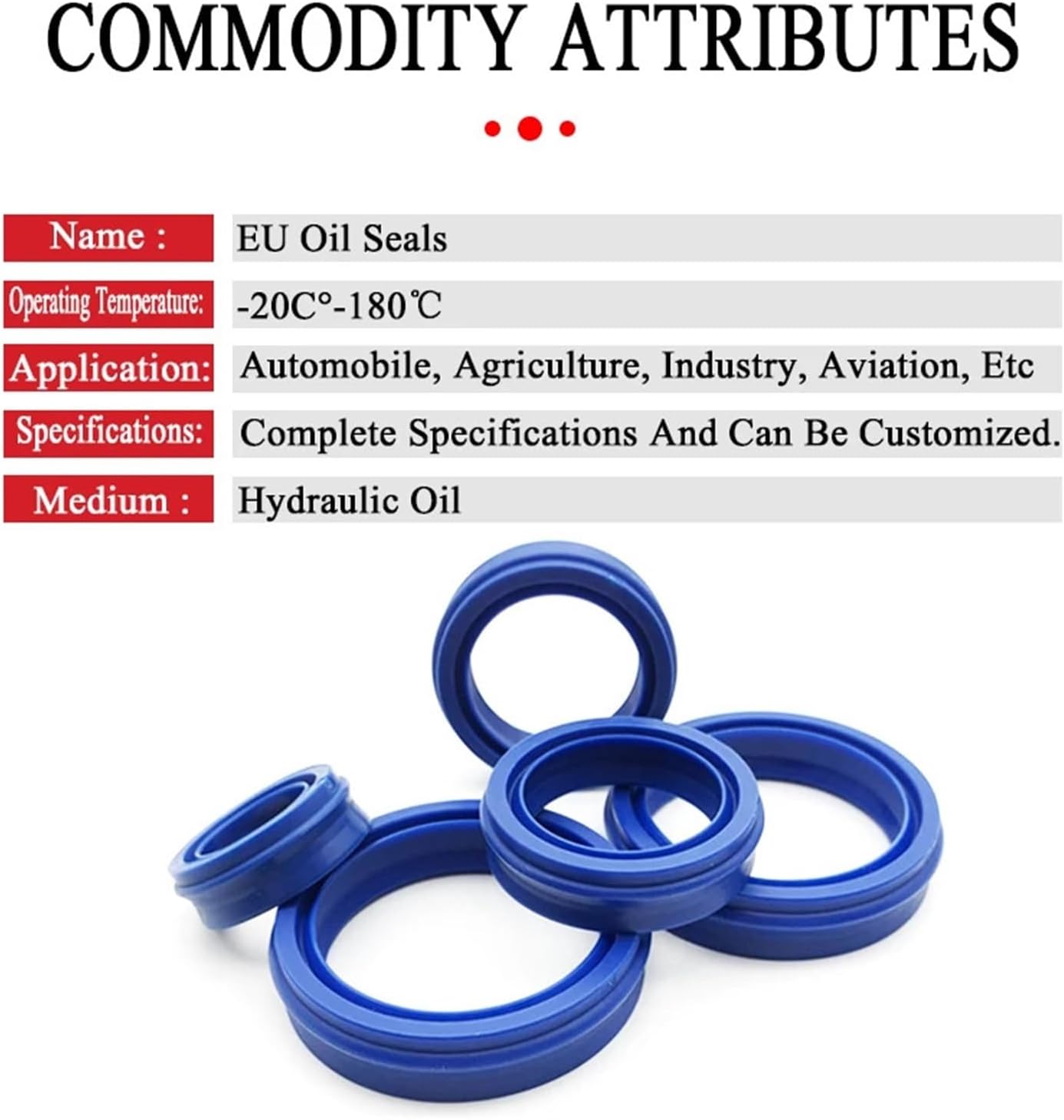 oil sealProduct Name:EU Type Oil SealMaterial: Polyurethane(PU)Colour:blueOperating Temperature:-20C°-180°CSize:Inner Dia x Outer Dia x Thickness / ID x OD x he.g: 12x19x10mm means ID=12mm OD=19mm h=10mmWorking Pressure:35MPAWorking temperature:-20~180Hardness:Shore A90±2Working speed:0.5M/SMedium:hydraulic oilFeatures:high abrasion resistance high resilience and good pressure resistance.Application:automotive agriculture industry aviation etc.Function: sealing dustproof and fixing.Package include:1pcs/5pcs EU Oil Seal==========Hign-concerned Chemical : NoneStandard or Nonstandard : StandardShape : Ring GasketModel Number : Oil Sealing RingMaterial : PolyurethaneColor : BlueName : Hydraulic oil sealProduct material : Polyurethane(PU)Temperature : -20~180Hardness : Shaw A90±2Features1 : Excellent wear resistanceFeatures2 : not sensitive to impact load and pressure peak qualityFeatures3 : High extrusion resistanceType : EU Oil SealsType1 : Cylinder Sealing RingPackage Include : 1pcs/5pcs