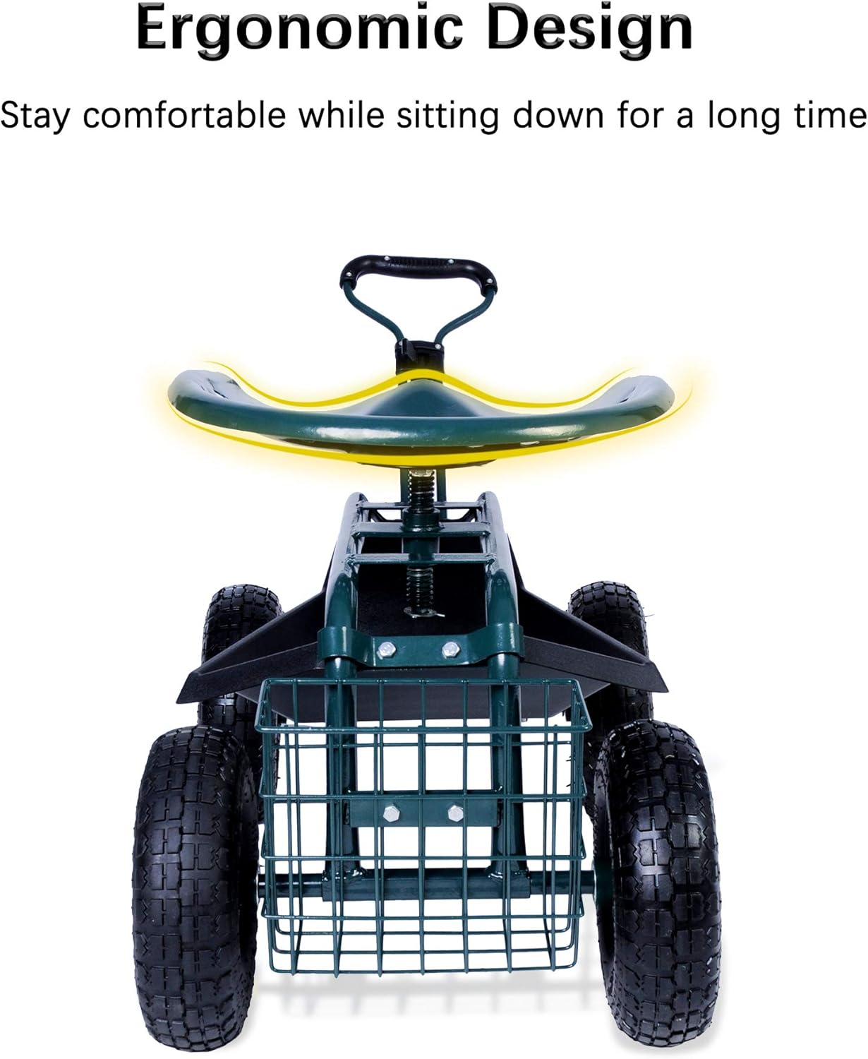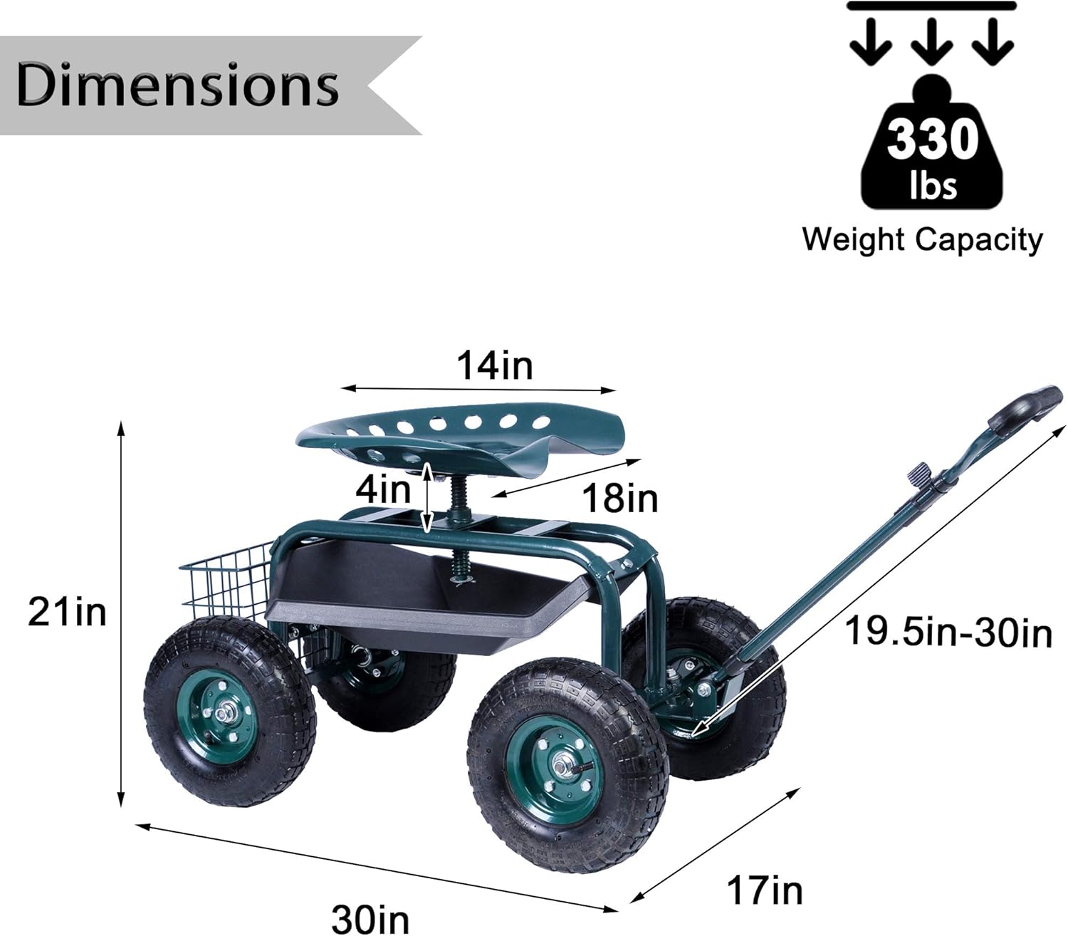 SpecificationStyle: garden workseatColor: greatMaterial: steel + EVA foamWeight Capacity: 330lbsSeat size: 18in x 14inWheel diameter: 10inStorage basket size: 9.5in x 4.2in x 8in