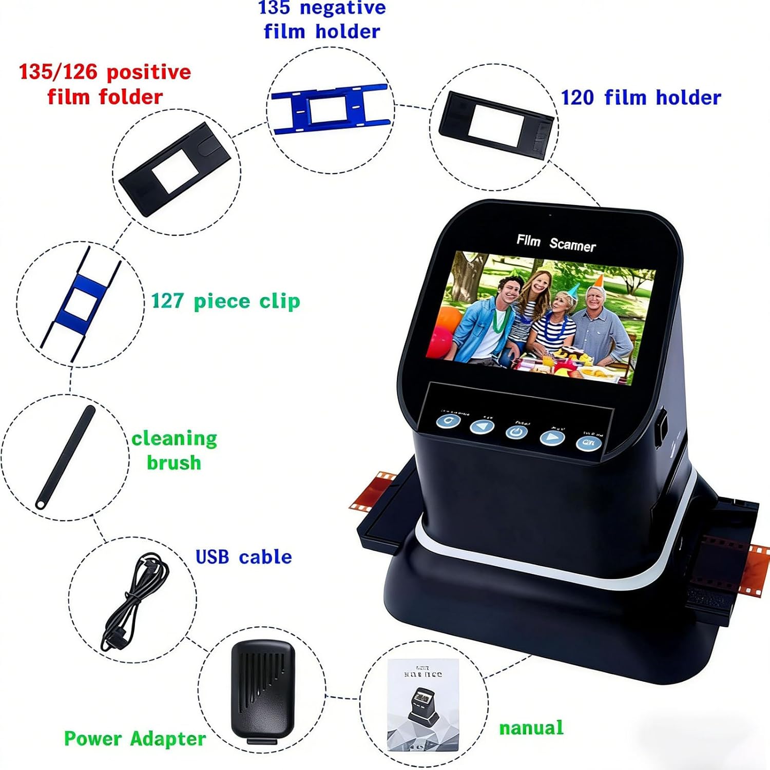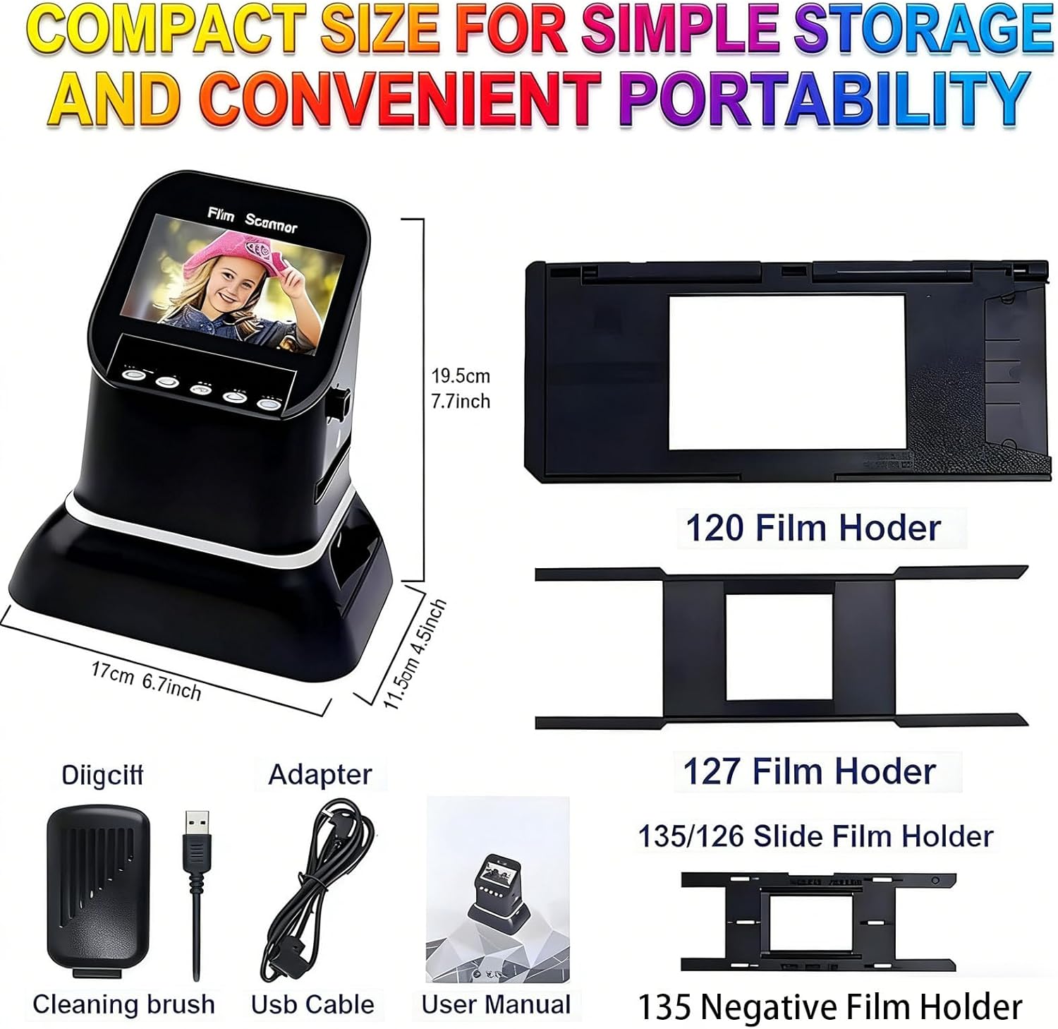 Product Description This Slide Viewer is designed to easily convert old film negatives and slides into clear digital photos, featuring a 4.3 inch LCD screen for convenient real-time preview and playback, making it ideal for preserving memories and viewing images without a computer Features ♥ Wide Compatibility: Supports 135 35mm 120 127 126 film negatives and slides including color and black and white formats for versatile use ♥ High Resolution Output: Provides up to 22MP interpolated resolution with 14MP optical clarity for sharp and detailed image conversion ♥ Fast Scanning: Converts images in just 1 to 3 seconds allowing quick and efficient digitizing of large film collections ♥ LCD Screen Display: Built-in 4.3 inch screen enables direct viewing editing and playback without external devices ♥ Multiple Functions: HDMI output USB connection multi-language support and compatibility with Windows and Mac systems for flexible use Package Includes ♥ Slide Viewer ×1
