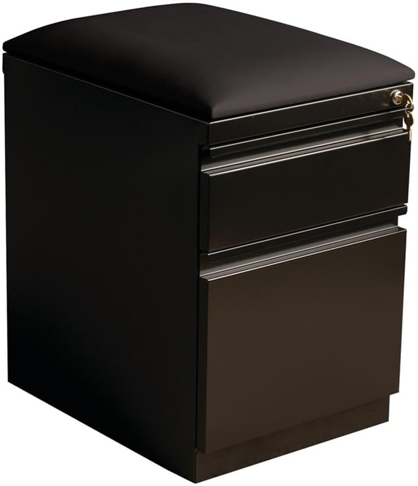 20-inch deep Metal Mobile Pedestal Files with a 2-drawer box/file drawer configuration in black and included seat cushion are designed to support the demand of today's office. The 100% polyurethane fabric and steel construction provide durable, easy to clean and sanitize surfaces. These commercial grade mobile pedestals come standard with factory installed hidden casters, full extension drawers, counterweights, and a core-removable lock for security. The file drawer accommodates letter-size hanging files. The ball-bearing suspension ensures a smooth and quiet drawer performance. Extended fronts with full-width drawer pulls provide a sleek and contemporary design. Available in multiple colors to enrich your workspace. 23.75" height allows these units to roll under most work surfaces. Ships assembled. Limited Lifetime Warranty. Unit meets or exceeds ANSI/BIFMA industry standards. Greenguard Gold Certified.Features:- Commercial grade ball-bearing suspension allows fully loaded drawers to open with ease- Core-removable lock- High-side drawers accept hanging file folders- Includes factory installed hidden casters for easy mobility- Includes counterweight to inhibit tip over- Accommodates letter-size hanging files- Full width J-pull handles- Box/File drawer configuration- Limited Lifetime Warranty- Greenguard Gold Certified- Greenguard Gold CertifiedSpecifications:- Product Dimensions: 23.75" H X 15.00" W X 19.88" D- Number of Drawers: 2- Assembly details: No Assembly Required; To ensure the key for this product does not get loose, slide the thumb latch on left side of handle to the right, at the same time, pull the drawer open. Keys are hanging inside the cabinet by the locking mechanism.- Furniture Subtype: Roll File Cabinets- Product Weight: 58- Assembly Required: No- Assembly details: Pre-Assembled- Product Color: Black