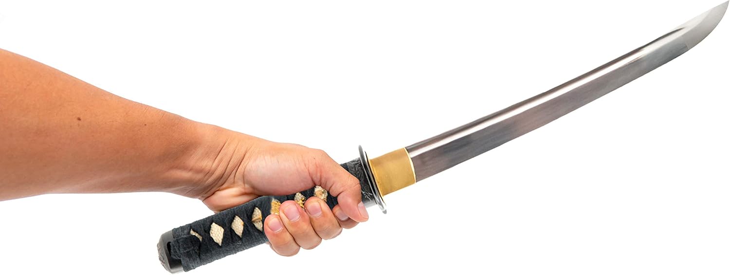 PRODUCT 724 Model: Sharpened Tanto Sword Tsuba: Musashi Tsuba Fuchigashira (hilt collar and pommel): Dragon Steel: 1045 Carbon Steel Blade: Fully hand forged heat tempered blade with long hi (blood groove) Edge: Sharpened by Japanese Whetstone Hamon (Tempered line): Yes Tsuka (Handle): Wood handle covered in genuine ray skin and wrapped in black cotton ito with menuki Tang: Full tang with 1 wood pegs (mekugi); engraved with Swordmith signature Saya (Scabbard): Reddish brown piano lacquered wood wrapped by black cotton sageo (cord) The sword can be fully disassembled and reassembled Blade Length (with Habaki): 12.25" Handle Length: 6.5" Overall Length(with Saya): 21” Weight with Saya : 1.4 lb Weight without Saya: 1.1 lb Package weight: 3 lb Package Includes: 1 * Assembled Tanto with saya 1 * Black cotton Tanto bag 1 * Tube cardboard Tanto box
