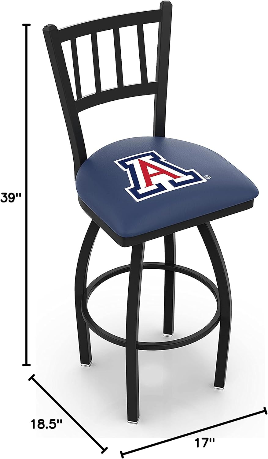 Made for the ultimate sports fan, you will be proud to show where your loyalty lies with this impressive Officially Licensed stool from the Holland Bar Stool Co. This contemporary L018 swivel logo stool has a defined Jailhouse back style that doesn't just add comfort, but sophistication. A state of the art print process is used in applying specially formulated UV vinyl ink in numerous stages to produce a sharp, crisp, clear image to ensure a perfect reproduction of the logo. You won't find a higher quality logo stool on the market. The frame is made from commercial quality 16 gauge, 1 1/4 inch tube steel with solid Mig welded joints to strength and durability. The powder coated finish resists chips and scratches and ensures a long-lasting, rich appearance. The cushion seats are of the highest quality as well, utilizing a breathable, commercial grade vinyl. At the heart of the cushion is 2 1/2 inches of highly-dense, US made foam that provides maximum support and will not breakdown in a couple years. If you're going to finish your bar, game room, or man cave do it right- with a logo stool made in the USA by the Holland Bar Stool Co.