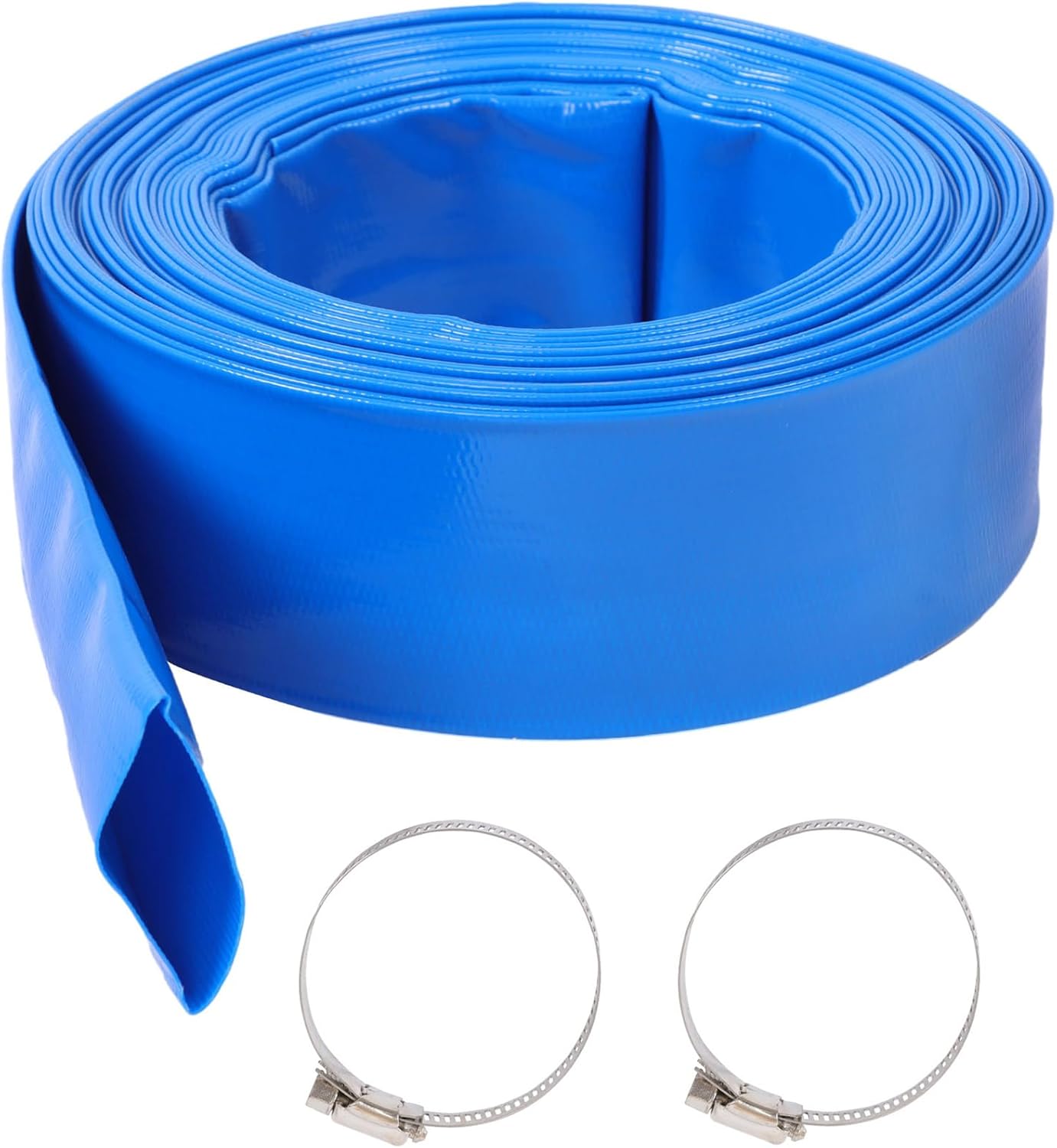 3" x 100Ft Lay-Flat Pool Backwash Hose with 2 Clamps Reinforced Heavy Duty PVC Discharge Hose Weather-Proof Vinyl Pool Drain Hose for Water Transfer Specifications:Heavy-Duty 100FT Pool Backwash HoseSize:3'' Inside diameter, Flat 5'' width;Suits for 3'' hose adapters, Replacement for 2.5'' or less size schedule 40/80 PVC hose (Max outside diameter not to exceed 3 inch, otherwise an adapter is required).Features:Drainage hoses are widely used, the discharge hose is essential swimming pool supplies, works as pool drain hose, pool pump hose, filter waste hose, also works for agricultural water discharge, irrigation, landscaping, construction dewatering and submersible pumping.Each hose is accompanied by a metal clamp for easy connection, and you can easily install it with clamps. After use, just roll it up and hardly take up any space, and then store it in a dry place for next use, away from direct sunlight.The advantage of the pool hose is it can be used multiple times and withstand rough handling.Designed to adapt to most outdoor conditions and withstand all seasons.Durability:The pool backwash hose can withstand 90 psi working pressure during water supply and drainageHigh tensile strength braided polyester fiber ensures long-lasting performance.Heavy-duty, superior strength, weather reliability.