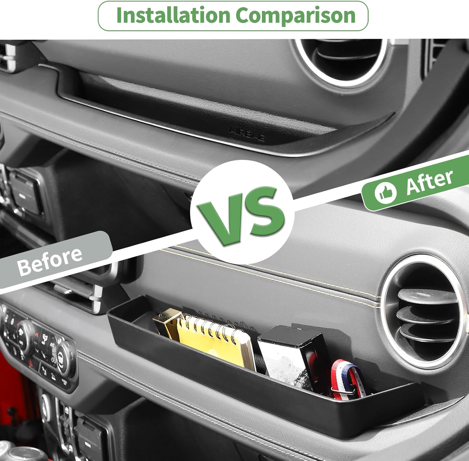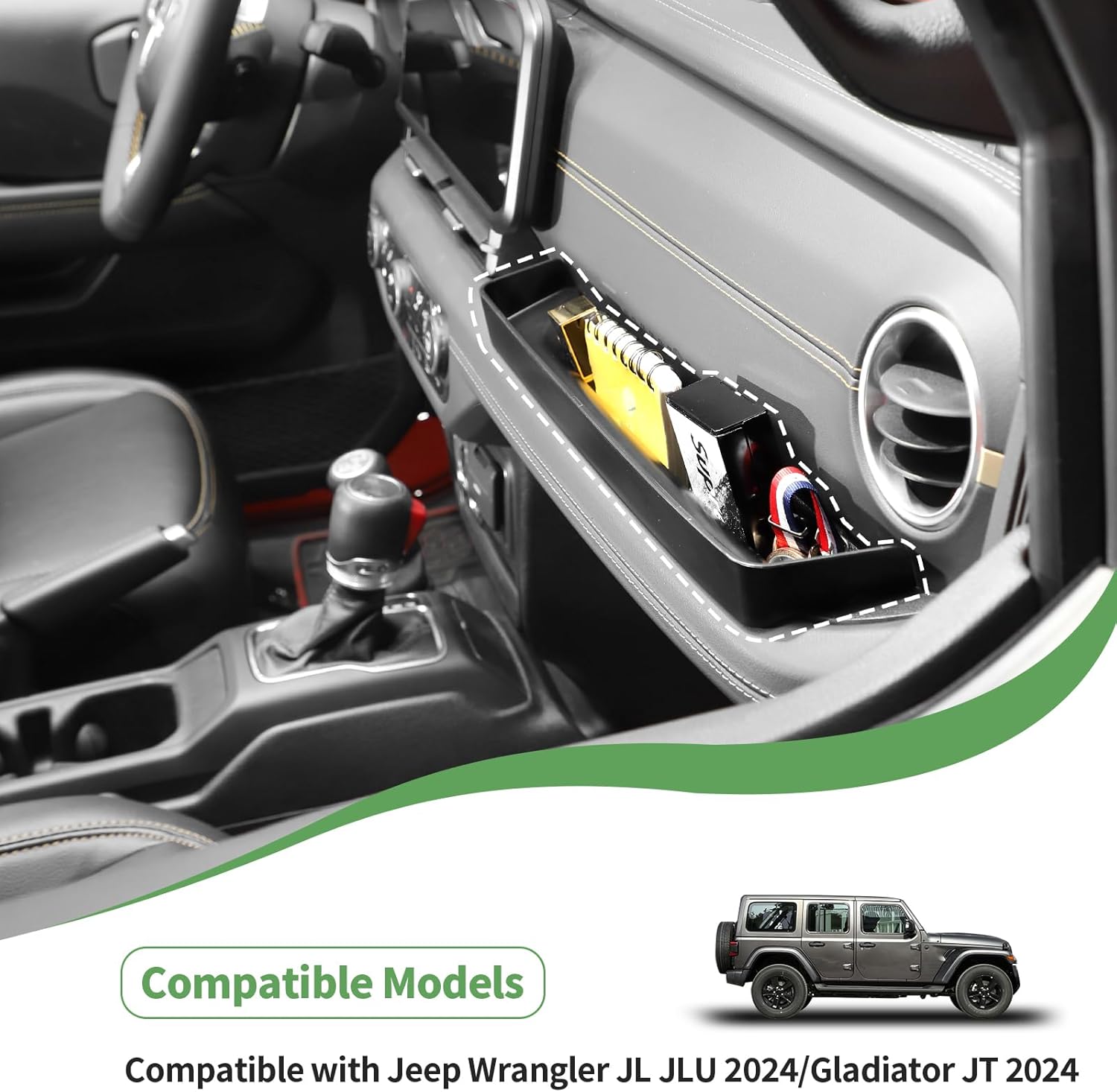 Fitment: Compatible with Jeep Wrangler 2024 JL JLU Sport Sahara Rubicon Willys & Gladiator JT Truck 2024. Features: - Extended Storage Space - Durable ABS Material - Hassle-Free Installation - OEM Fit - Interior Accessories for Jeep Wrangler JL Great Addition. JeCar passenger side storage container gives extra space for your vehicle. Put it on and you can store cell phones, coins, keys, and any other little things. Hassle-Free Installation. No drilling is required, and it is easy to install. Take less than 30 seconds to unbox and install. Peel the double-sided tape off and drop the storage container into the opening. Quality Construction. Made of quality ABS plastic with a matte finish. You won’t regret having it on your vehicle. Package Included: - 1 x Storage tray