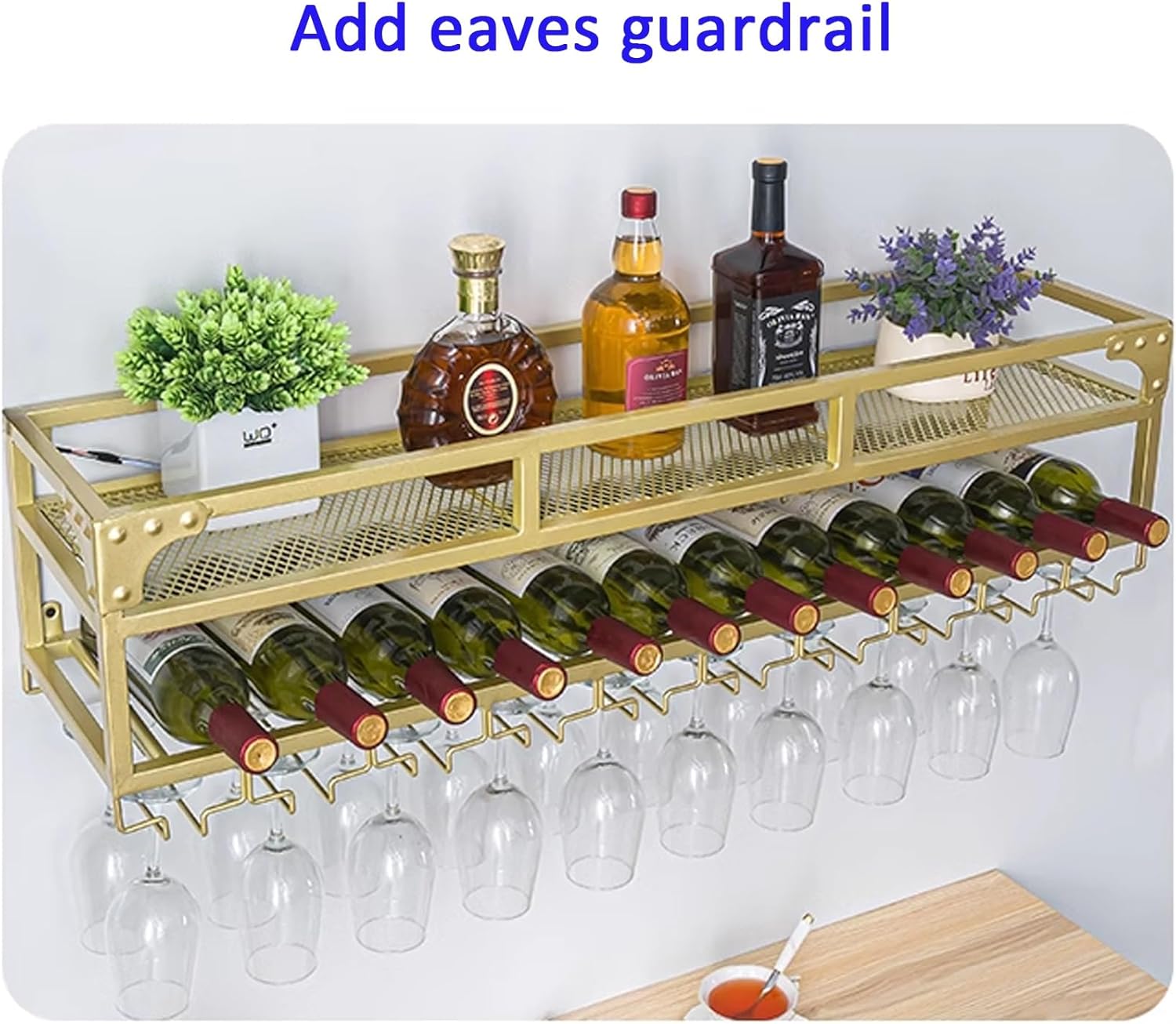JKGHK wine bottle rack adopts hollowout grid design, which strengthens the load-bearing capacity and is convenient for storage. It is easy to clean without dust accumulation.The back light bar design makes it easy to take out things when the optical fiber is insufficient, bringing a different color to the space.The large-capacity classification storage of wine shelf and the multi-pattern design make the storage more organized and more beautiful.Multiple metal cup racks can be used to place wine glasses at will, with delicate welding and humanized tracks, which are convenient and practical.Name: Wall mounted wine rackMaterial: MetalColor: Black , Gold , Black A , Gold APlacement: Wall-mountedDimensions: 60/80/100/120/150×14/27×25 cm / 39.3/47.2/55.1×31.4×9.8 inPlease install it on the wall of concrete or brick wall to ensure the long-term use.Package Includes:- 1x wine rack- 1x screw setPlease Note:1.Only wine holder is included, other items shown are not part of the package.2.Due to lighting and monitor differences, colors may vary slightly from the images.3.Permissible measurement error: +/- 1-3cm.