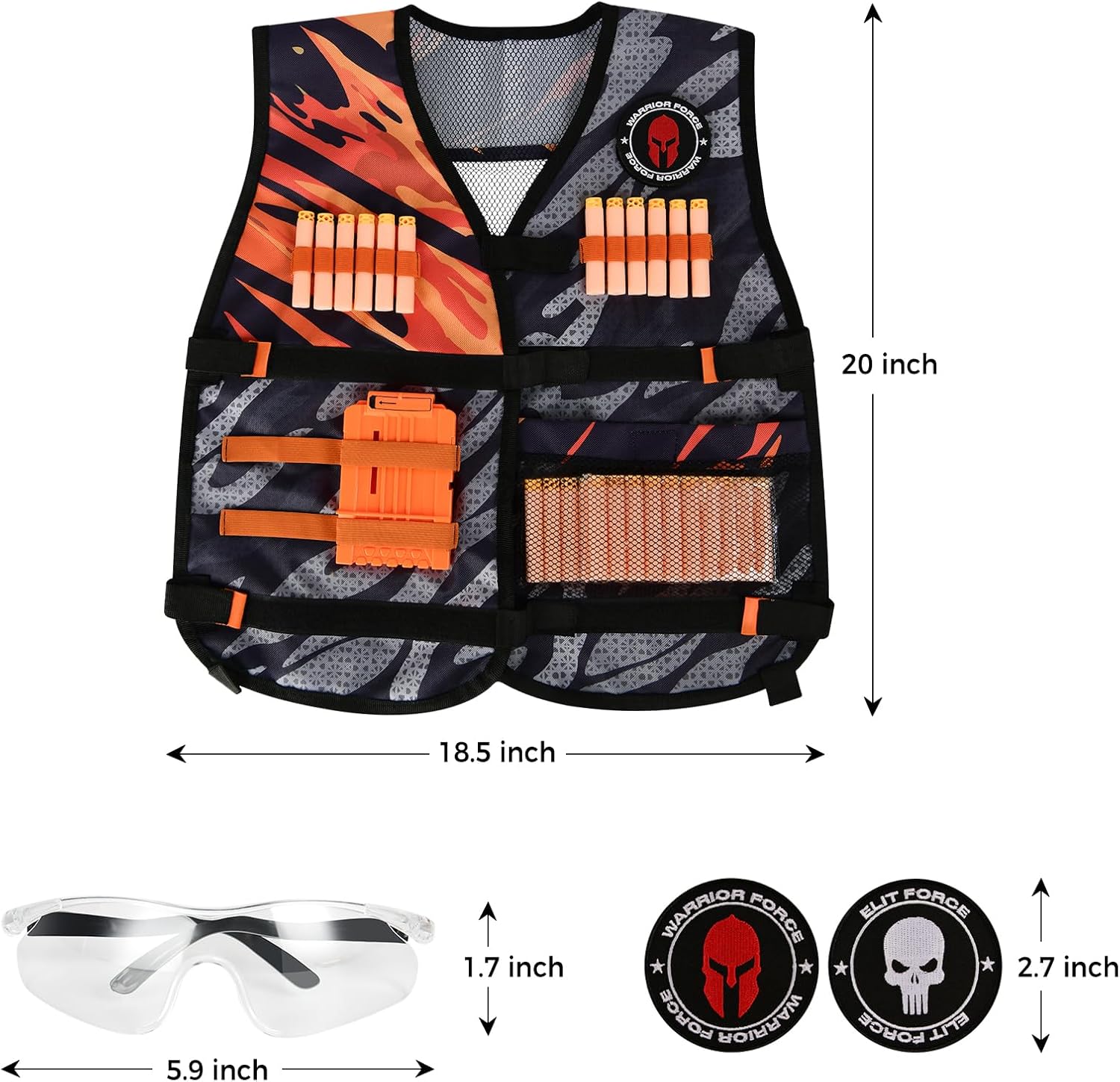 Kids Tactical Vest Kit Perfect for NERFGUN Party Games Yomuse Tactical Vest Kit Vest is Durable and Breathable.with Darts Loops and Pocket to Hold the Darts. Foam Darts Made of Soft Sponge Plastic Materials to Help Buffer Impact Force, Safer Shoot in Games.Adjustable Vest Design, Fit for Big Kids. The Best Choice For KidsThe Best choice for Kids. An Attractive Indoor or Outdoor Game for Your Boy and Girls. Package included: 2 Pcs Vest 2 Pcs Glass Protector 2 Pcs Dart Pouch 2 Pcs Face Mask 2 Pcs Wrist Band 2 Pcs Short Reload Clips(6 darts) 160 Pcs Refill Darts 2 Pcs Gun Toys