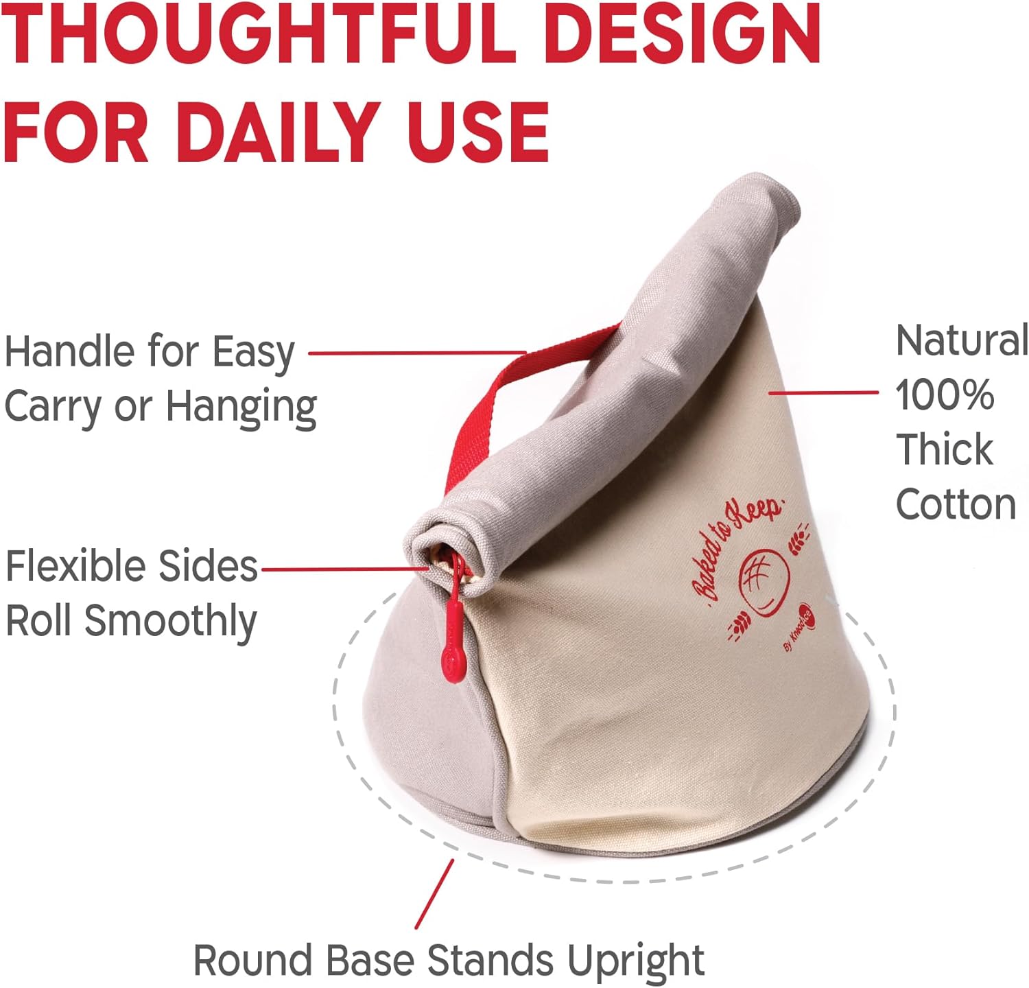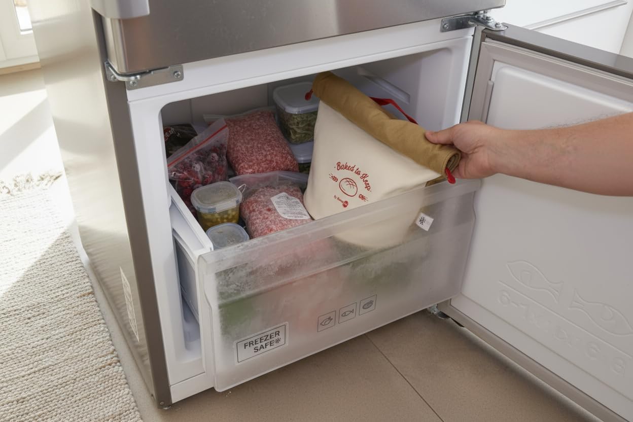 The Bread Bag, Reinvented by KneadAce Whether you’re storing a golden-crusted sourdough on your counter or stashing loaves in the freezer, the KneadAce Bread Bag is designed to keep your bread fresher, longer without the waste of plastic. Crafted with a 100% thick natural cotton exterior and lined with food-safe, water-resistant TPU, this bag creates a barrier that protects against air, moisture, freeze burns and odors. The result? A loaf that stays crusty on the outside and soft on the inside, just as it should. The roll-top design seals in freshness with a zipper and stays neatly rolled using flexible wire built into the sides. And unlike soft fabric bags that fall over or collapse, our rounded base design keeps it standing tall on any surface. -Use it at room temp for daily storage -Or freeze your loaves for longer freshness -Washable, sturdy, and designed to last Our bread bag also makes the perfect gift for home bakers and sourdough lovers who care about flavor, sustainability, and style.