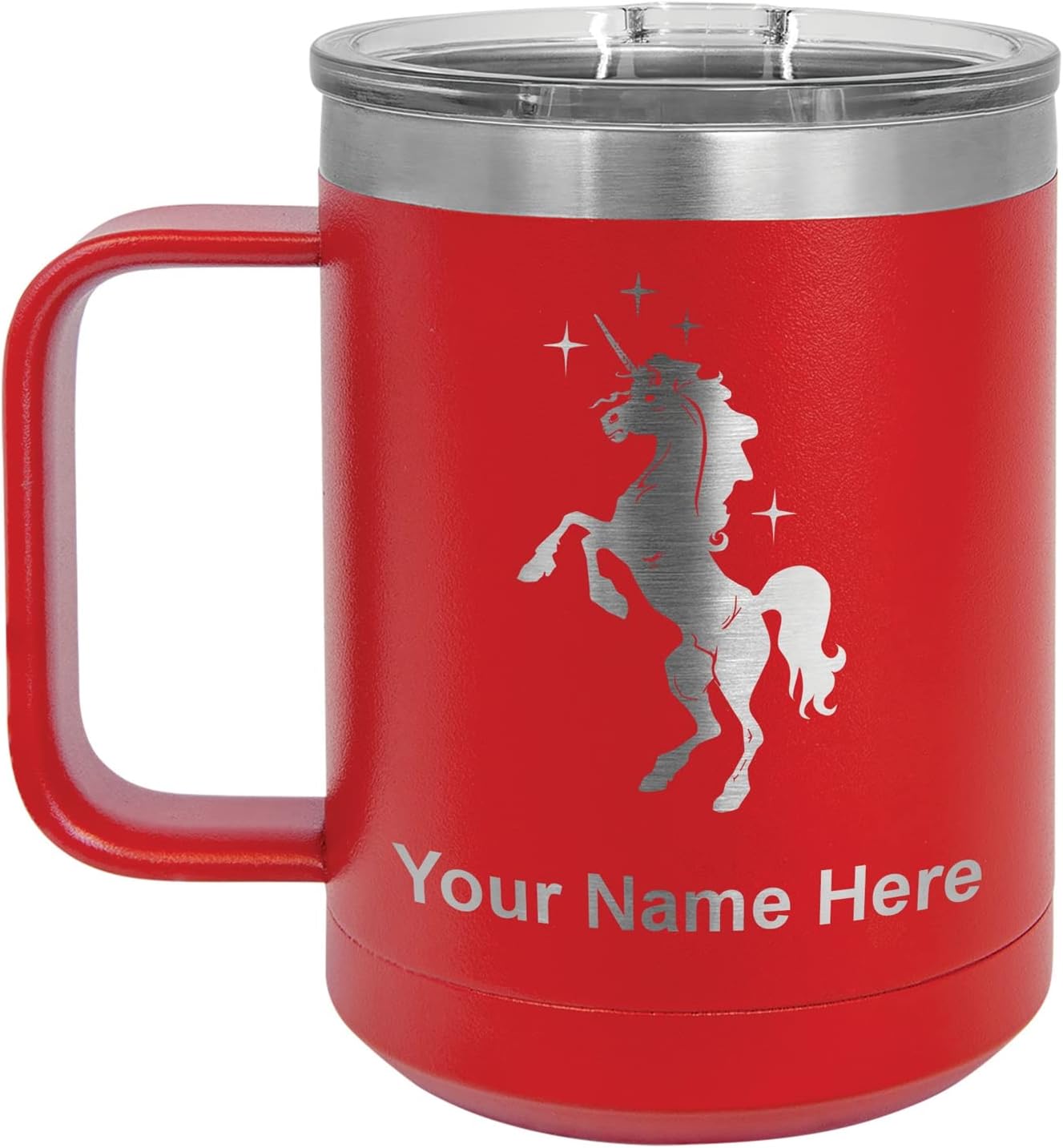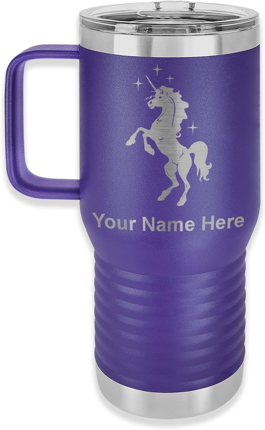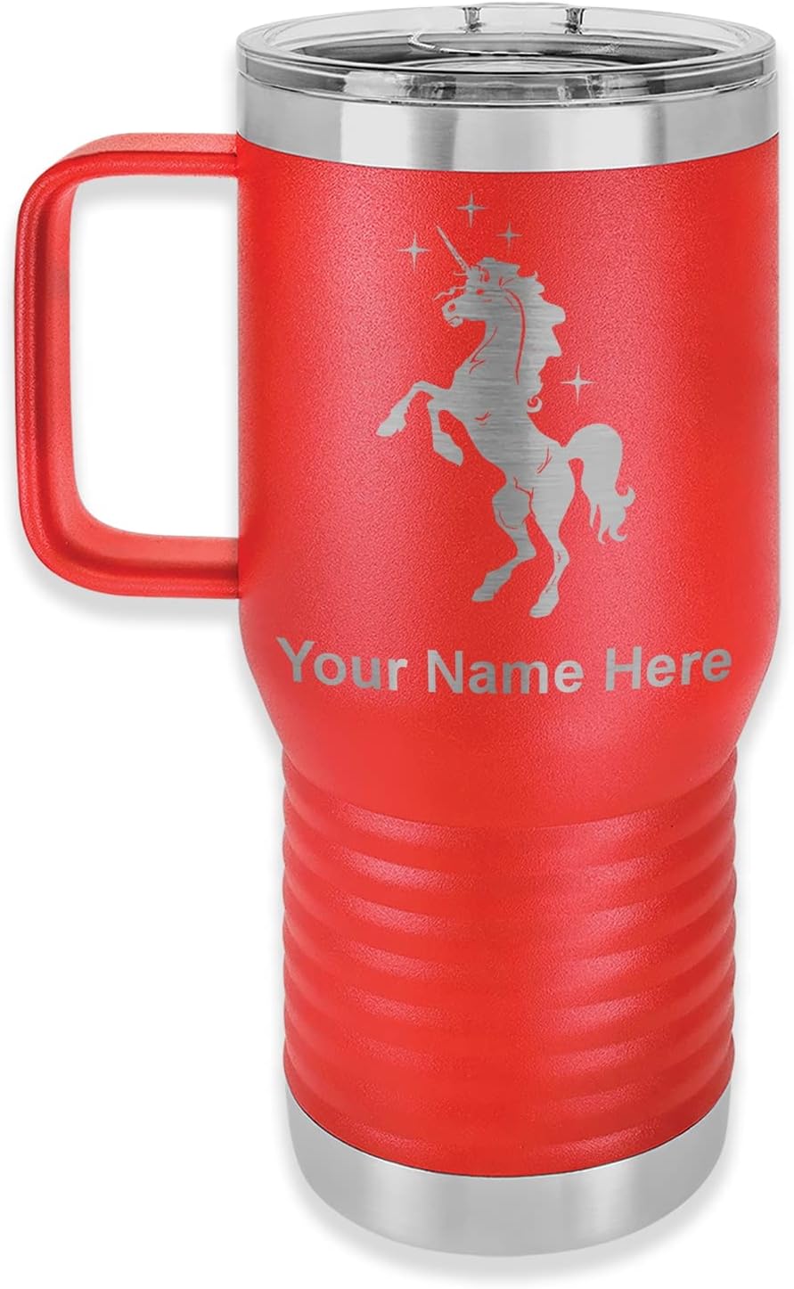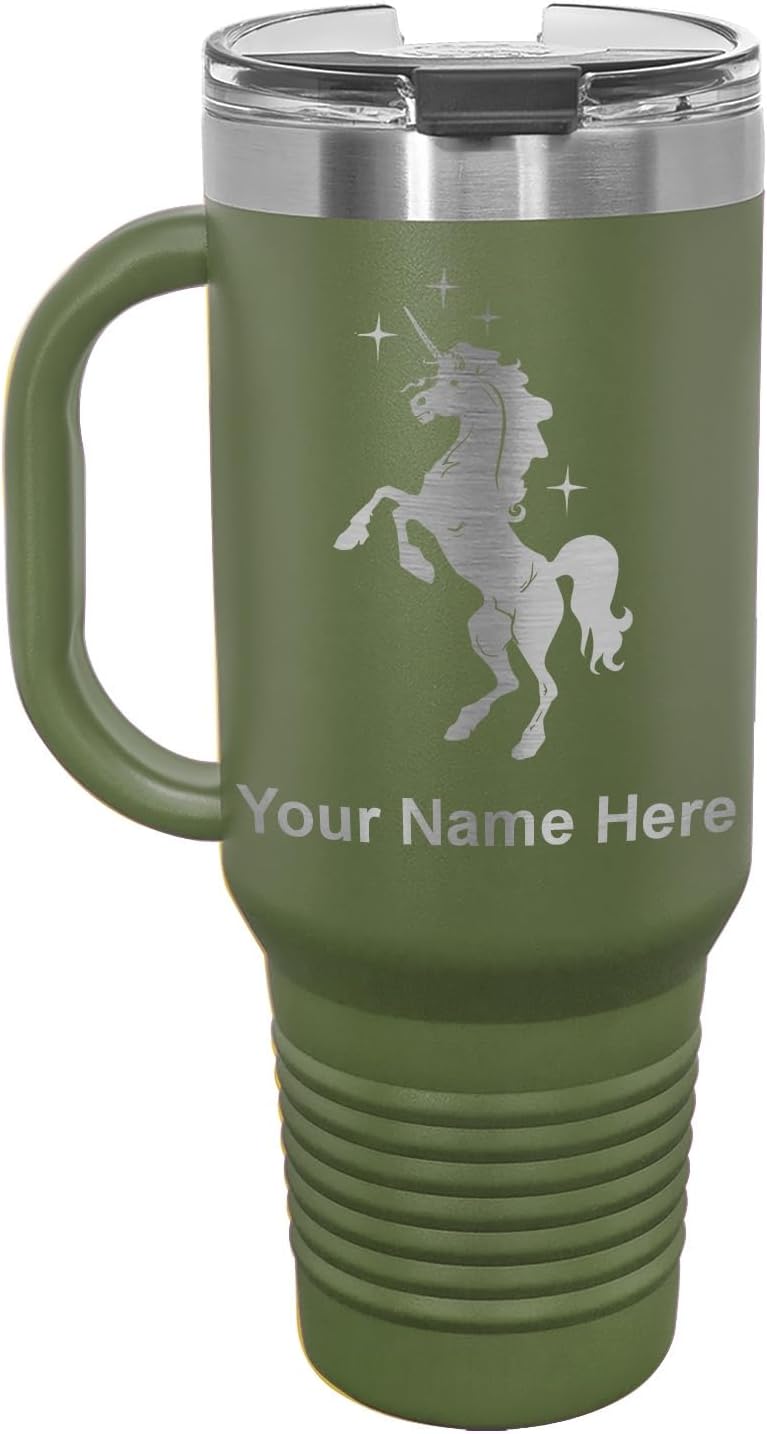 LaserGram 40 ounce Travel Mug with Handle that is laser engraved with the image that you see in the photo. Your own personalized text will be laser engraved below the image. Features double-walled stainless steel vacuum insulation with a clear lid. Click the "Customize Now" button to begin customizing your mug.